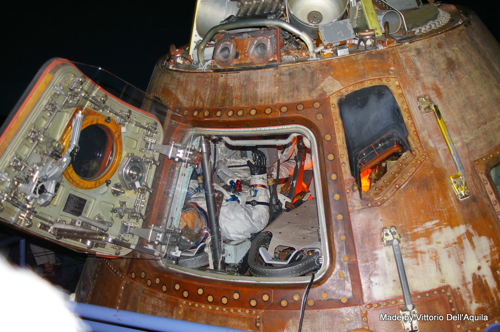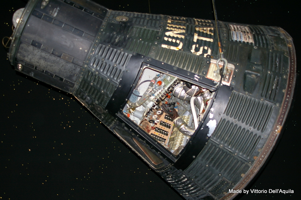 . Se qualcuno ci andrà consiglio vivamente a meno di non conoscere bene l’inglese o lo spagnolo di non prendere l’audioguida, perchè è unicamente in quelle due lingue (e difatti mia moglie che non conosce ne una lingua ne l’altra se la è portata dietro per nulla…). Nell’ingresso (ghiacciato, al solito come in tutti i locali texani fuori 33°, dentro 19°…) ci sono sulla sinistra uno shop center e il fotografo dove farsi fare la foto ricordo vestiti da astronauta oppure in assenza di peso all’interno della ISS (utilizzando il trucco del chromakey) e sulla destra l’ingresso a due auditorium dove si svolgono proiezioni di lanci e miniconferenze che illustrano l’attività in corso (per esempio in quel giorno parlavano del FD 9 di STS132). Dietro a questi due auditorium si accede alla sezione “memorabilia” che presenta alcuni pezzi realmente interessanti: La Mercury 9 di Gordo Cooper, la Gemini 6 di Schirra e Stafford e la Apollo 17 di Cernan, Schmitt e Evans.