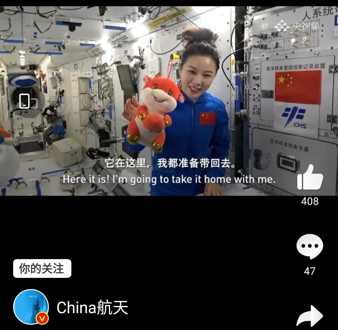 Curiosità: Wang Yaping dice che riporterà a casa con sé i propri lavori di calligrafia realizzati in questi mesi ed il pupazzetto rosso a forma di mucca arrivato a bordo di Tianzhou-3.