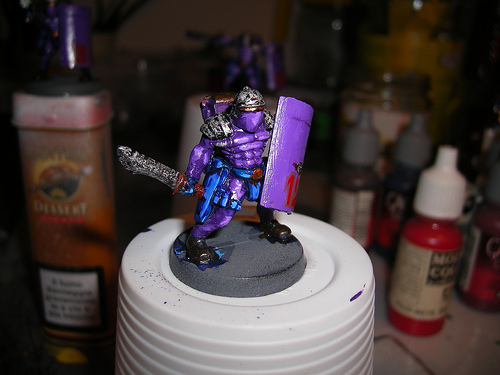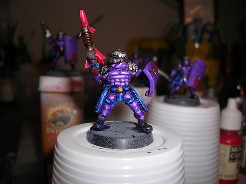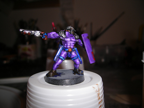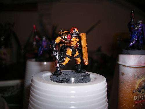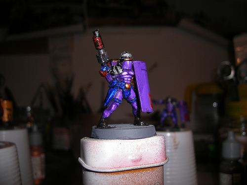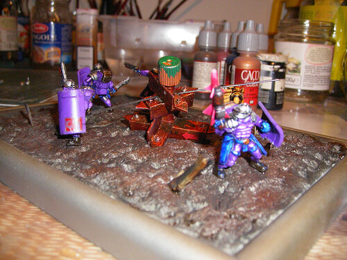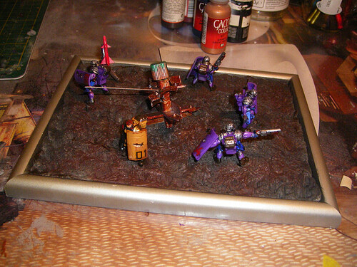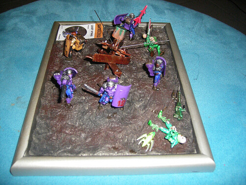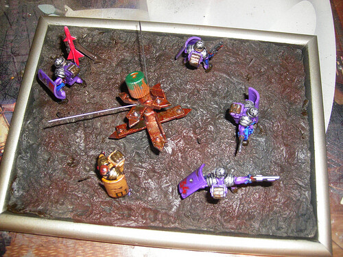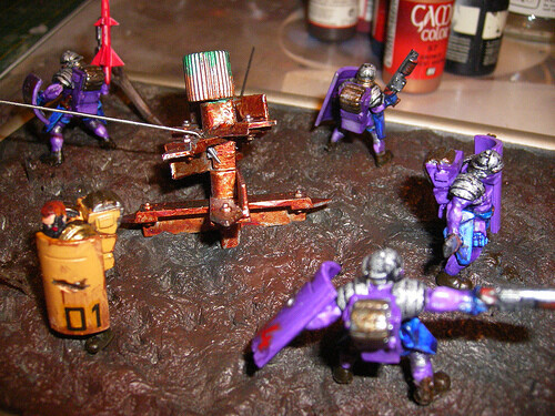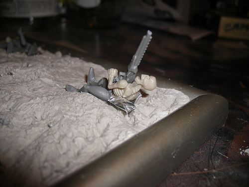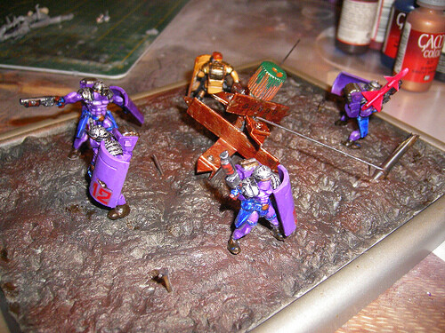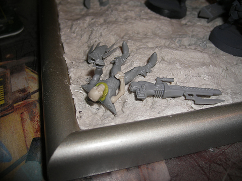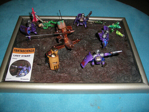 Bene, dopo aerei, carri e quant’altro provo a ‘rilassarmi’ un po’ con un soggetto sci-fi. Immagino l’ultima (forse) disperata resistenza di un manipolo di legionari spaziali, impegnati contro forze preponderanti. Largo alla fantasia ! Un lavoro ‘estivo’, senza patemi di precisione storica… Visto il molto tempo a disposizione prima del termine, lo inserisco nella campagna ‘Model discount’ del sito ‘modellismopiù’. I figurini dei ‘legionari’ sono in metallo, ed appartengono alla ormai defunta serie ‘Void’, un gioco 3d sci-fi con figurini in 30mm, che qualche anno fa provò, inutilmente, a contrastare il successo di ‘Warhammer 40.000’. Scolpiti discretamente, erano un’alternativa alquanto economica ai pezzi, senza dubbio molto più pregiati, della Citadel. I cadaveri scarnificati dei ‘Vladi’ sono in effetti una combinazione di pezzi Citadel in plastica, più esattamente si tratta di ‘Eldar oscuri’, da Warhammer 40.000, e guerrieri Skeleton, da Warhammer. Programma dei lavori ? Divertirmi un po’…