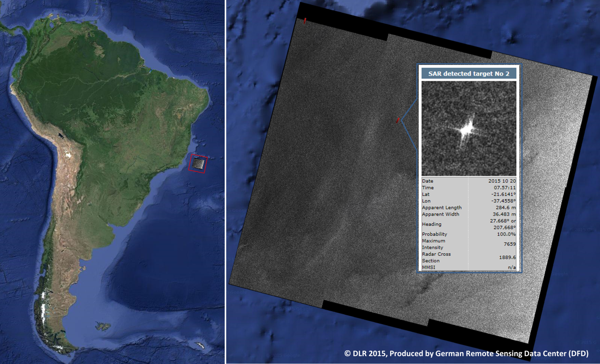 radar scan,della costa del brasile è stata ricevuta e processata in soli 13 minuti presso le sedi DLR di Oberpfaffenhofen e Neustrelitz rilevando la presenza di una nave che è anche stata identificata pochi minuti dopo.