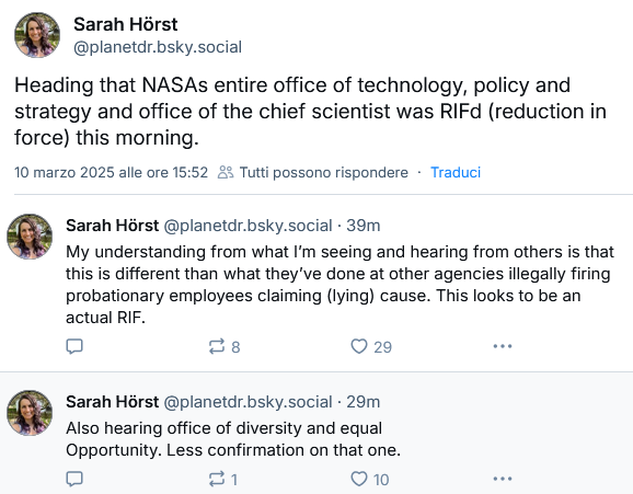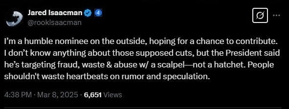 Dettaglio interessante: due giorni fa Isaacman aveva scritto di non sapere nulla di “supposti tagli” e invitava a non perdere tempo dietro voci e speculazioni perché l’amministrazione si sarebbe concentrata su frodi, sprechi e abusi, con il bisturi. Possibile che non lo stiano nemmeno informando?