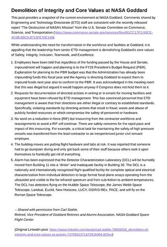 Un contributo di Carl Stahle, Vice President of Goddard Retirees and Alumni Association, NASA , sulla situazione al Goddard Space Flight Center.