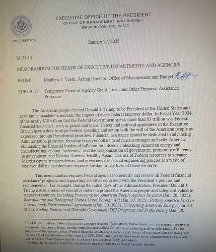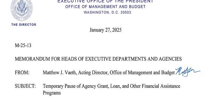 Parla chiaramente di sospensione temporanea, precisamente dal 28 gennaio a non oltre il 10 febbraio, quindi in effetti la pausa è breve. Inoltre specifica chiaramente che vanno tagliati solo i finanziamenti che impattano su quello che l’amministrazione ritiene spreco di tasse e cita i vari ordini esecutivi. Il documento ufficiale sembra che non limiti veramente quanto sancito dal Congresso.