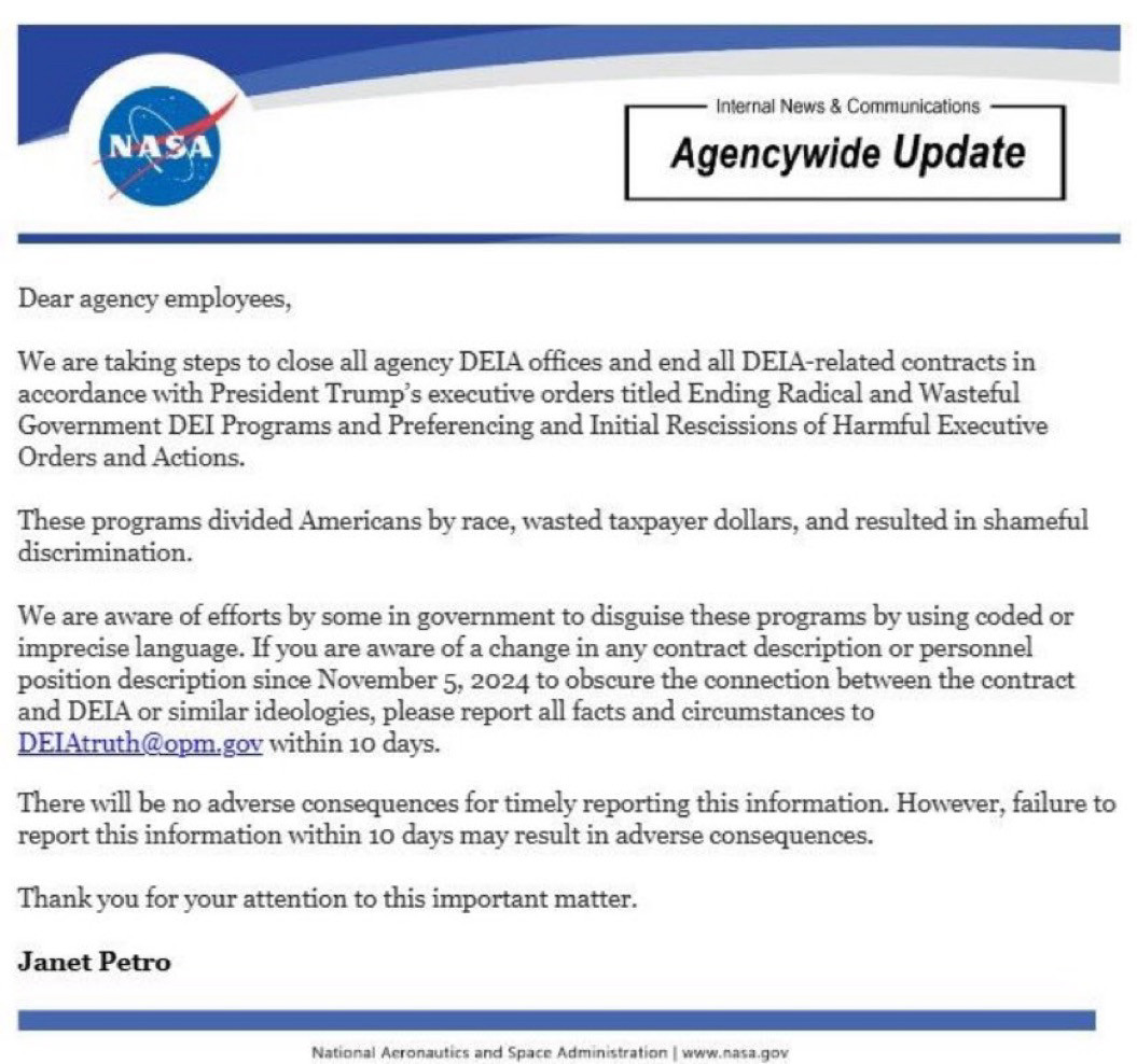 Mail arrivata (anche) ai dipendenti NASA. Si chiede di denunciare eventuali programmi DEI interni all’agenzia che siano stati “mascherati” sotto nomi differenti e si minacciano apertamente conseguenze in caso non si provveda.
