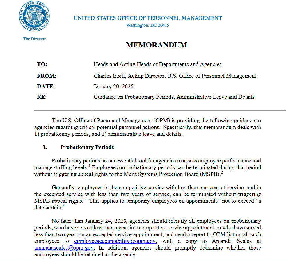 A proposito di mandare a casa la gente, e restando sempre a livello di chiacchiere da bar, segnalo un memorandum inviato ieri dall’U.S. Office of Personnel Management a tutte le agenzie e i dipartimenti del governo in cui viene chiesto di fornire entro quattro giorni una lista dei “probationary employees”, cioè di quegli impiegati che essendo ancora “in prova” (uno o due anni, a seconda della mansione, da quel che capisco) non possono fare ricorso contro un eventuale licenziamento.