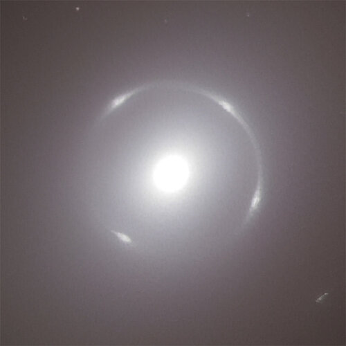 However it is beyond astonishing that the first lens is very nearby, actually located in an NGC galaxy – from the New General Catalogue of nearby galaxies – and that it shows a perfect Einstein Ring of the source galaxy. The lens galaxy is NGC 6505, located at redshift z=0.042, corresponding to a distance of only 590 million light-years. Only five similarly nearby other gravitational lenses are known so far, but none in such a prominent galaxy. NGC 6505 has been known since the year 1884, but no-one up to now was able to take an image as clear as Euclid has done. Follow-up spectroscopy with the Keck telescope on Hawaii and its KCWI integral-field spectrograph showed the source galaxy to lie at redshift z=0.406, or about 4.5 billion light-years distance from us.