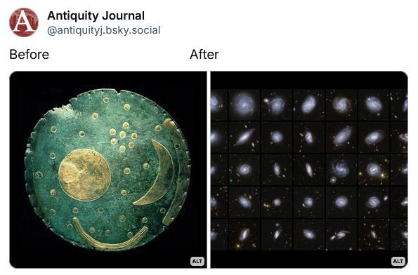 Left. The Nebra Sky Disc, a Bronze Age find that might be the oldest known depiction of the cosmos. It features the sun, moon, and perhaps the Pleiades. Credit: Dbachmann / CC BY-SA 3.0