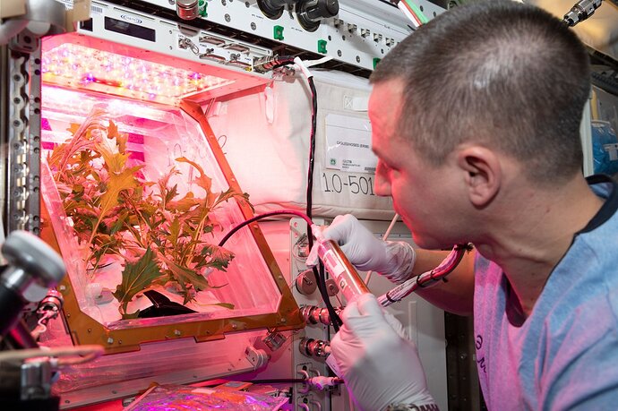L’agricoltura spaziale a bordo del laboratorio in orbita va avanti da diversi anni al fine di imparare a fornire cibo fresco agli equipaggi nello spazio. Jessica Meir e Andrew Morgan, astronauti della NASA, hanno portato avanti questa ricerca tagliando le foglie di Mizuna (senape giapponese) per assaggiarle ed hanno riposto le rimanenti in un freezer per le analisi scientifiche.