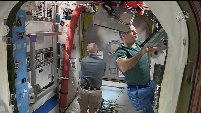 Dopo un’eccitante fase di fascettatura cavi e pulizie dei luoghi di lavoro, gli astronauti Bob Behnken e Chris Cassidy si stanno avviando verso la fase finale dell’EVA (continuando a fascettare).