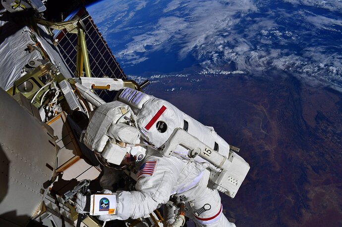 Le tute dei russi sono molto belle ma hanno dei “colori curiosi”… La mia modalità complottista non riesce a dare una spiegazione decente all’ abbinamento dei colori… Non so nemmeno quanto tempo ci voglia per realizzare tute di diverso colore, se occorra concordare con gli altri partner della iss il vestiario etc. Cercando su google ho trovato tute blu come standard e poche variazioni.