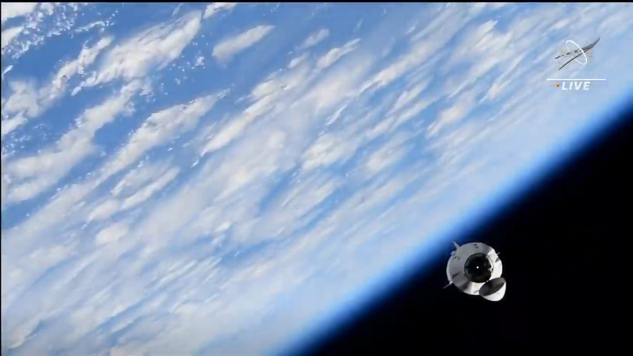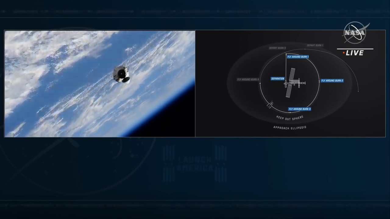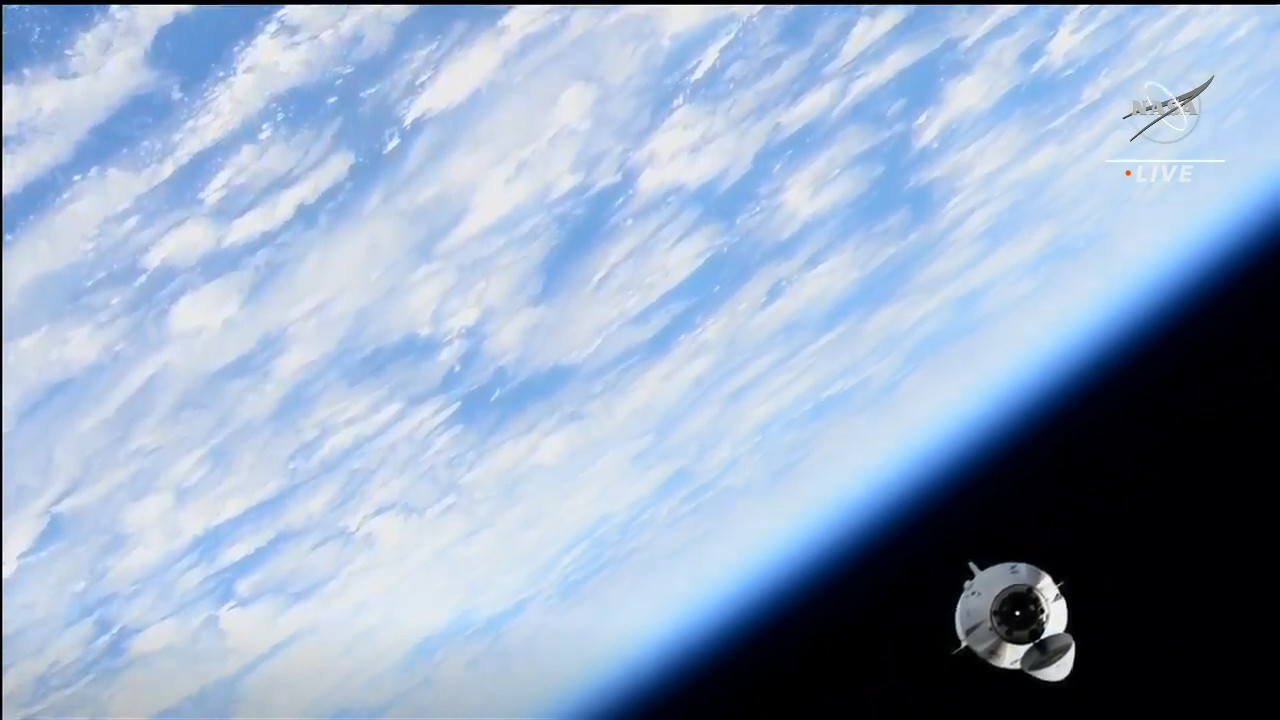 Continia il flyaround, e siamo circa a metà della manovra mentre la Dragon e la ISS vengono illuminate da una nuova alba orbitale…