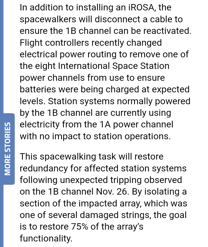 Durante la prossima EVA (installazione iROSA su canale 3A) verrà disconnesso un cavo dal pannello in difficoltà (1B) per vedere se il problema potrà essere risolto