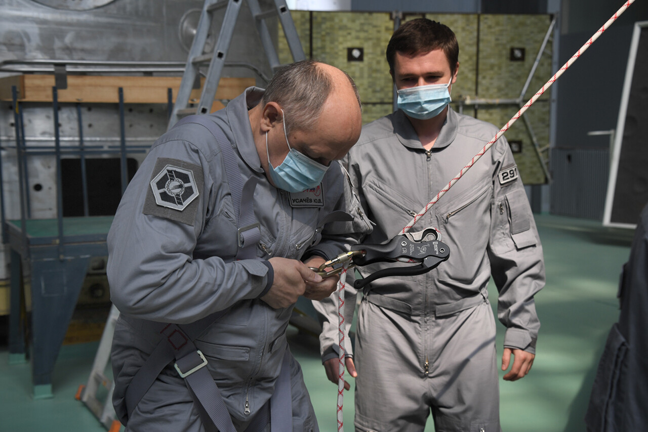 Queste foto ritraggono i tecnici collaudatori di Energia mentre testano il dispositivo che serve per lanciare fuori del veicolo la fune con la quale i cosmonauti potranno lasciare il veicolo, qualora dovessero uscire senza l’aiuto delle squadre di soccorso.