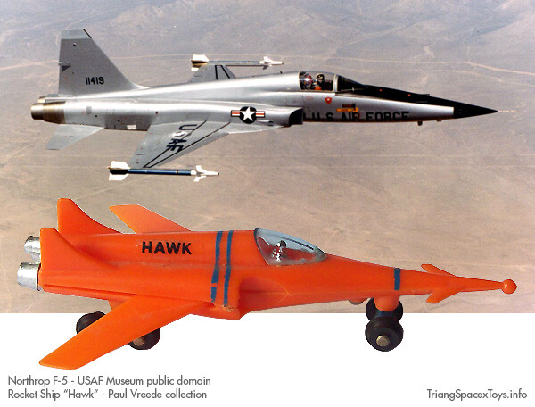 Secondo il sito http://www.triangspacextoys.info dedicato al mondo Triang-Spacex la fonte di ispirazione per lo Hawk (al netto della doppia deriva, dell’ala a geometria variabile e delle alette canard, il top della novità all’epoca) sarebbe il Northrop F-5A “Freedom Fighter”, un caccia leggero all’epoca nuovo di zecca e presto protagonista anche della guerra in Vietnam: