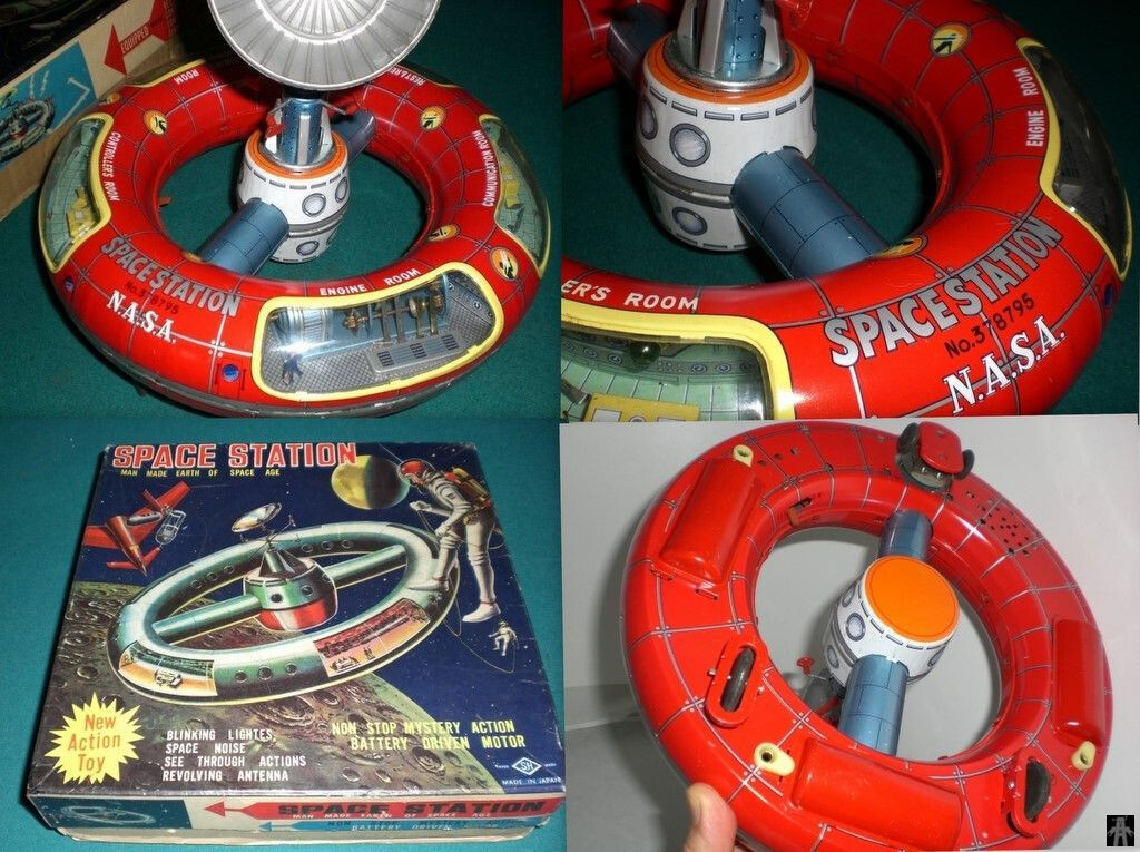 Naturalmente, sebbene siano un soggetto più raro, nemmeno le stazioni spaziali si sottraggono alla logica dei giocattoli. In particolare la giapponese SH (Horikawa) mette in commercio, nei primi anni '60, questa “Space Station” con movimento a ruote con batteria. Se è vero che la cover art rimanda immediatamente alla stazione toroidale di von Braun e compagni (apparsa alla metà degli anni '50 sulla rivista Collier’s) ad uno sguardo più attento si vede che il giocattolo in realtà si ispira a qualcosa di più concreto.