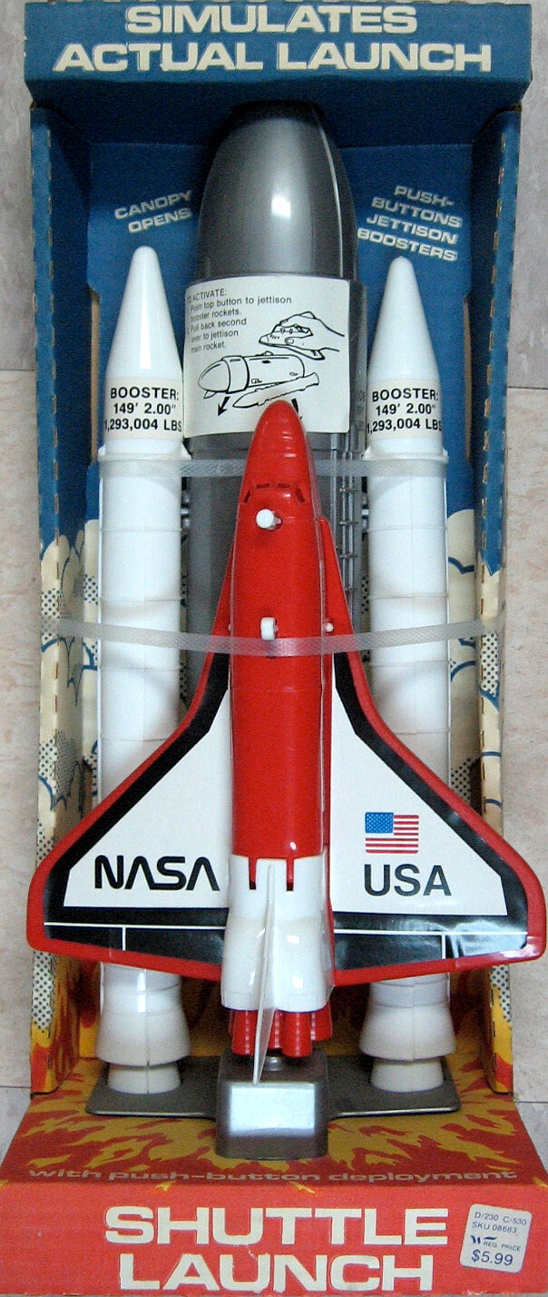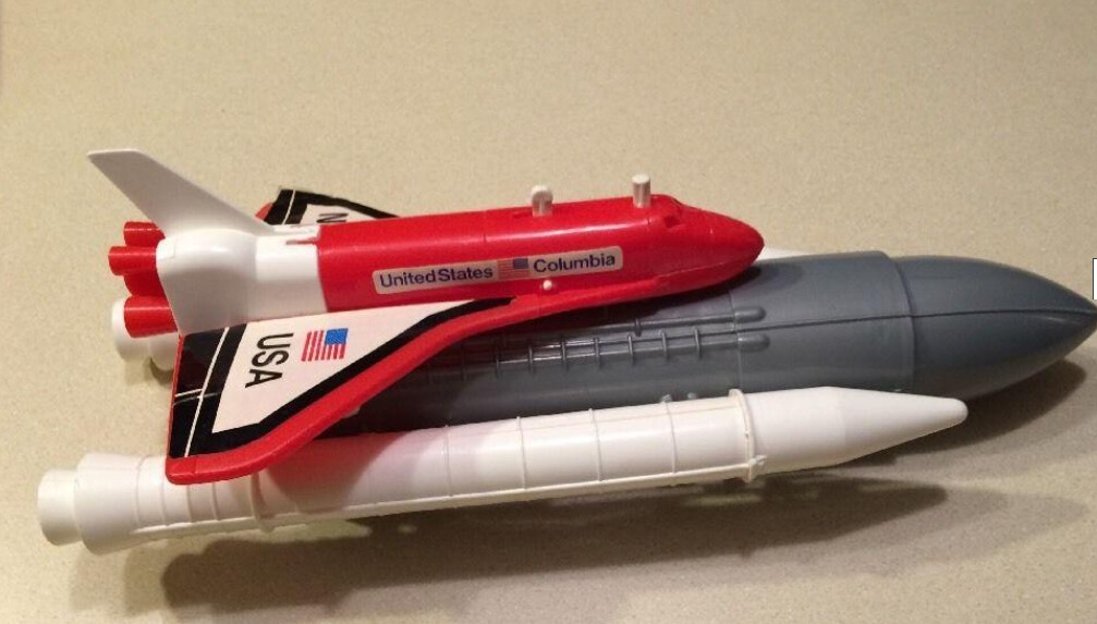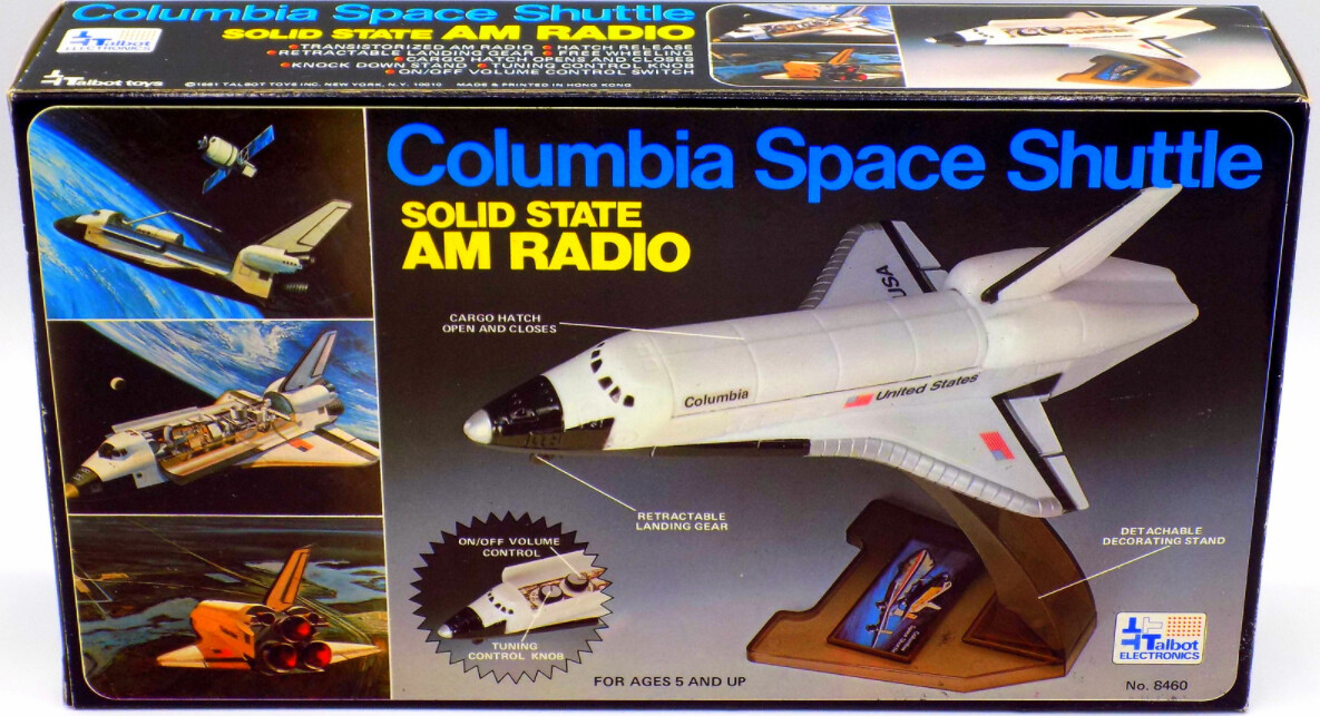 Naturalmente, essendo anche l’anniversario del primo lancio dello Shuttle, non potevo dimenticare il Columbia. Pur non essendo un giocattolo in senso stretto, di seguito abbiamo un’interessante radio AM a forma di Shuttle Columbia, messa in commercio dall’americana Talbot Electronics proprio nel 1981: