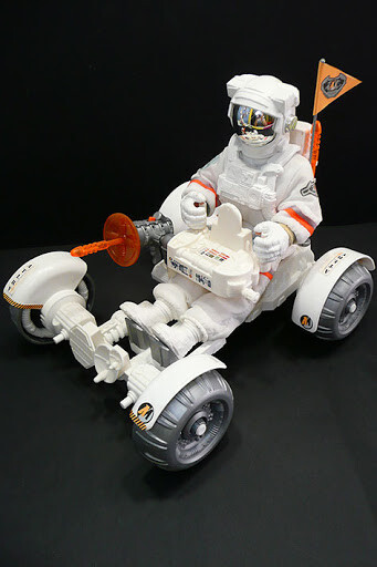 Il rover è chiaramente ispirato a quello reale, una volta tanto con il colore bianco corretto, detto questo le somiglianze terminano qui. Il rover è monoposto anziché biposto e dunque di dimensioni ridotte rispetto all’originale, l’antenna ad ombrello è sottodimensionata e sono aggiunte delle antenne in più (davanti) di fantasia, il quadro di comandi non è realistico e “dulcis in fundo” Action Man indossa una EMU dello Shuttle con il backpack dell’A7-L dietro, insomma un pasticcio. Inutile dire che il colpo di grazia lo ha dato l’utilissima bandierina…