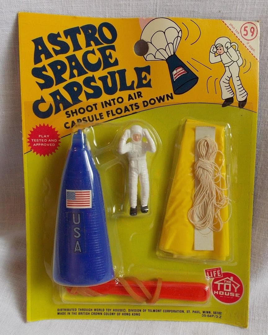 Iniziamo con una capsule Gemini (diciamo…) prodotta dalla Lone Star Toys Ltd inglese a partire dal 1965. La capsula, che non somiglia molto ne alla Gemini ne alla Mercury, ha un astronauta che si eietta (senza paracadute!!!).