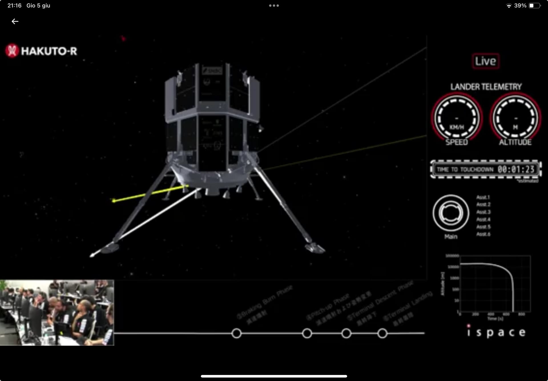 Partiti i video generici invece della diretta. Le ultime due letture che si sono viste dell’altitudine sono passate da circa 550 a 50 metri nel giro di forse un secondo, per quel che vale la telemetri pubblica.