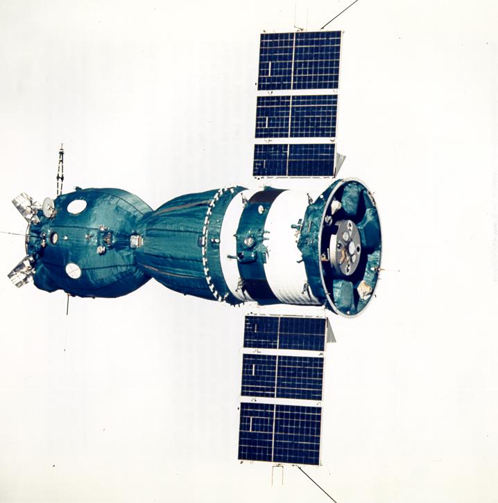 Si tratta di una Soyuz 7K-TM, la versione usata per il programma ASTP, è facilmente riconoscibile dal connettore universale di docking a prua (a differenza delle altre soyuz che montano il connettore maschio, la “sonda” ) l’equipaggio era di due persone, non penso avesse capacità di effettuare un EVA.