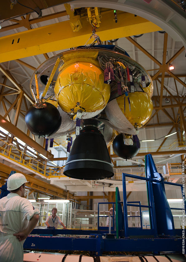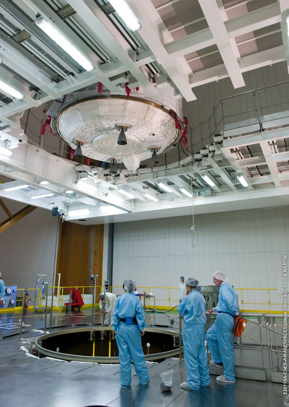 Nelle immagini ATV viene sollevato dall’area di prepazione del payload e viene abbassato sul lanciatore.