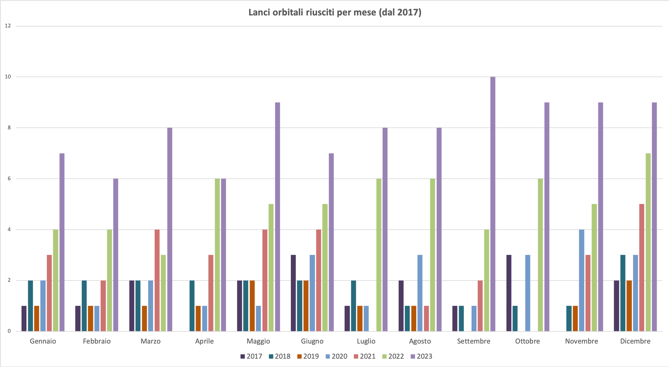 In nessun mese dell’anno ci sono stati meno di 6 lanci, mentre in settembre si è raggiunto il numero record di 10 lanci. In tutti i mesi è stato stabilito il nuovo record per numero di lanci ad eccezione di aprile, i cui 6 lanci di quest’anno hanno solo eguagliato quelli del 2022.