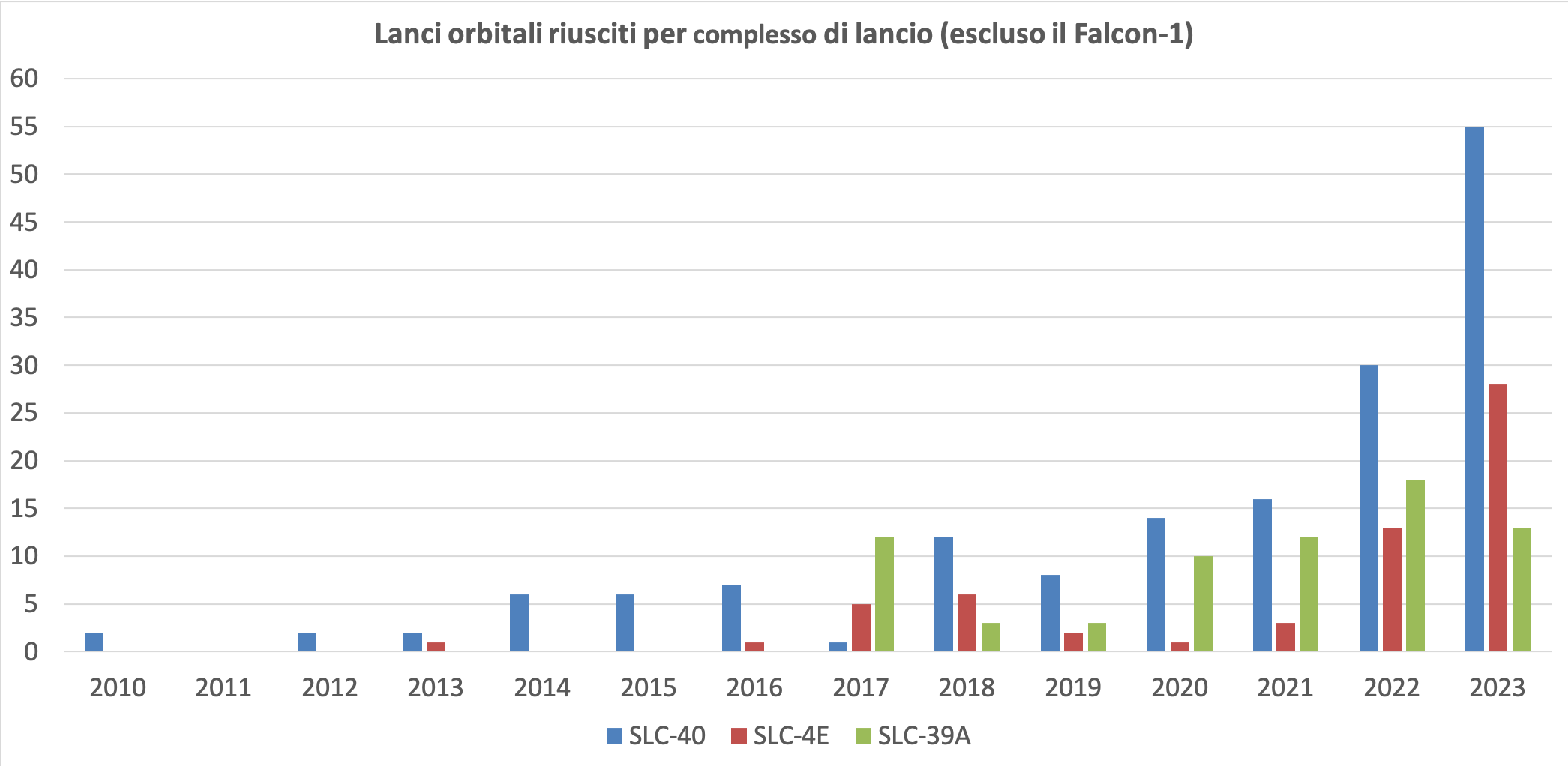 Le rampe SLC-40 di Cape Canaveral e SLC-4E di Vandenberg hanno visto rispettivamente 55 e 28 lanci (nel trionfale 2021 furono rispettivamente 16 e 3) mentre la SLC-39A di Cape Canaveral è stata utilizzata “solo” 13 volte (l’anno scorso i lanci furono invece 18).