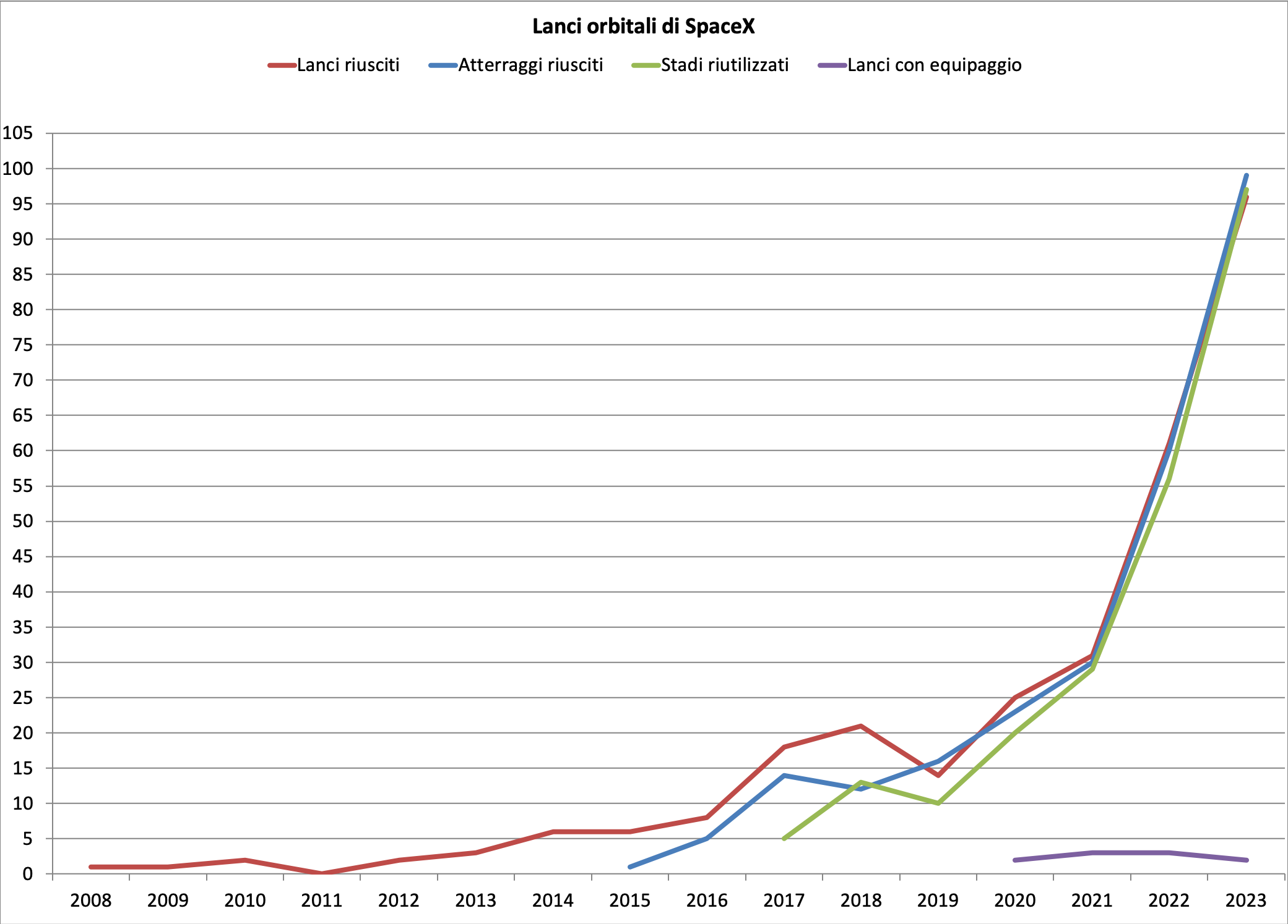Ogni anno SpaceX è in grado di stupirci e di alzare l’asticella (già altissima) dell’anno precedente. Nel 2023 sono stati effettuati 96 lanci orbitali, 99 atterraggi e riutilizzati un totale di 97 booster, di fatto triplicando i numeri del 2021. Solamente nel numero dei lanci con equipaggio SpaceX è rimasta tra i comuni mortali, effettuandone tra l’altro solamente due, facendo quindi peggio sia del 2022 che del 2021.