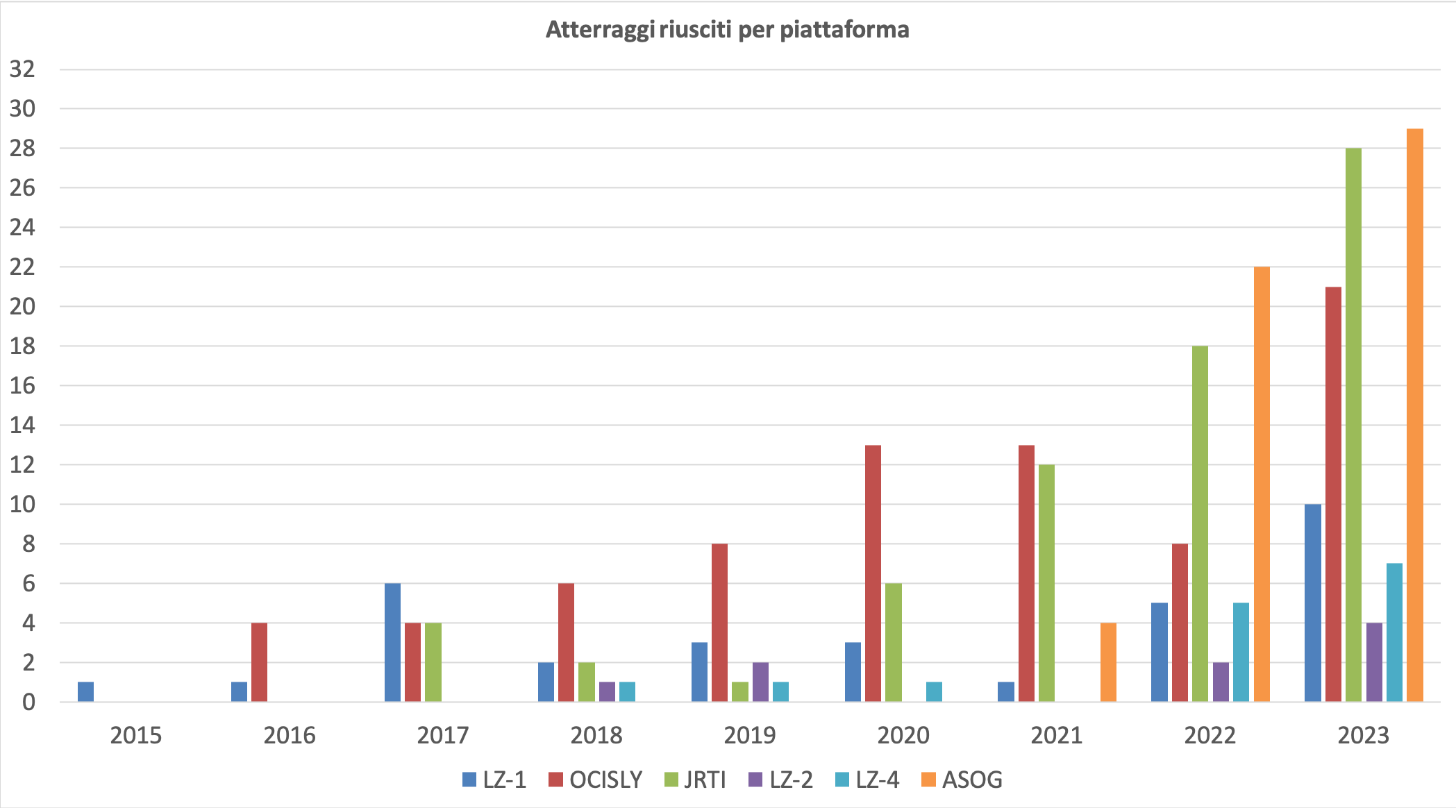 Per quanto riguarda invece gli atterraggi si è sfiorata quota 100, fermandosi come si diceva a 99. Tutte le piattaforme/zone di atterraggio hanno stabilito il proprio record in questo 2023, con ASOG che guida la truppa a quota 29 atterraggi, seguita da JRTI con 28 e da OCISLY con 21. I meno frequenti atterraggi su terraferma hanno visto prevalere la LZ-1 con 10 atterraggi, seguita da LZ-4 con 7 e infine LZ-2 con 4.