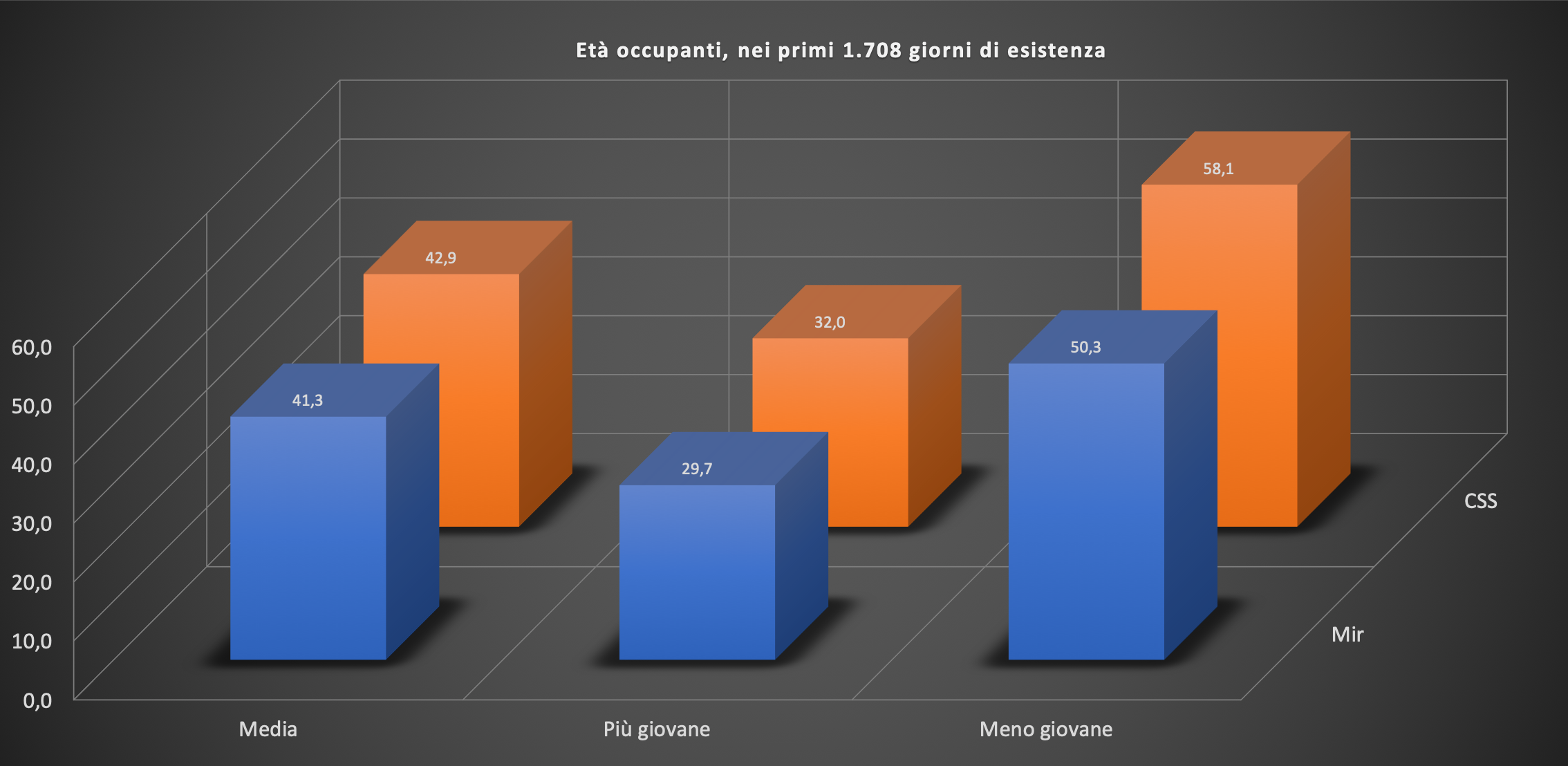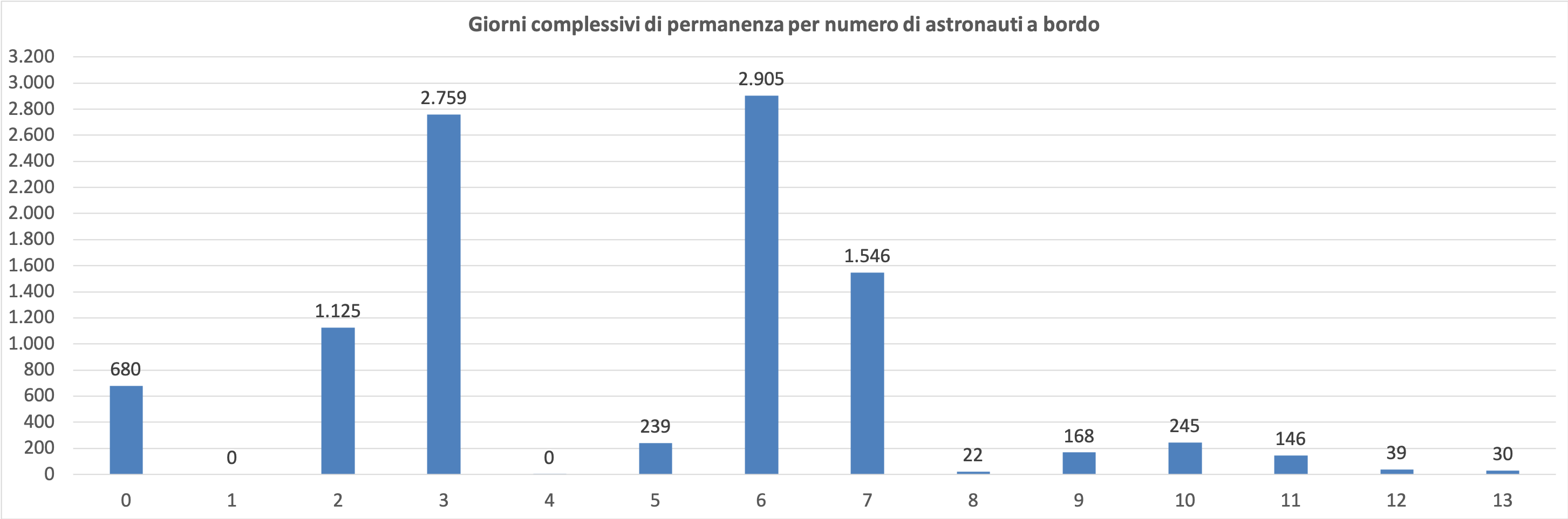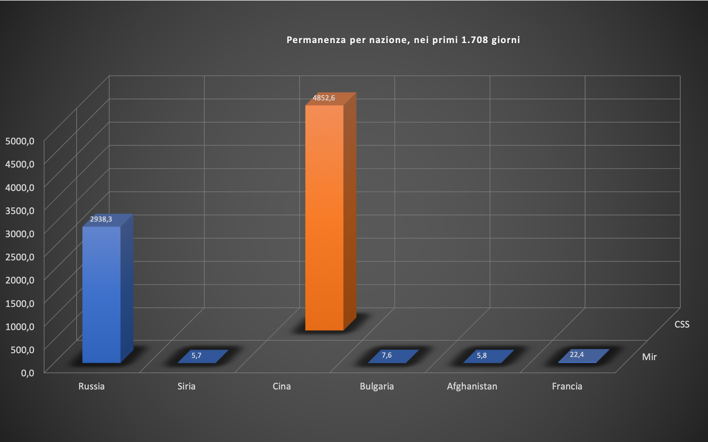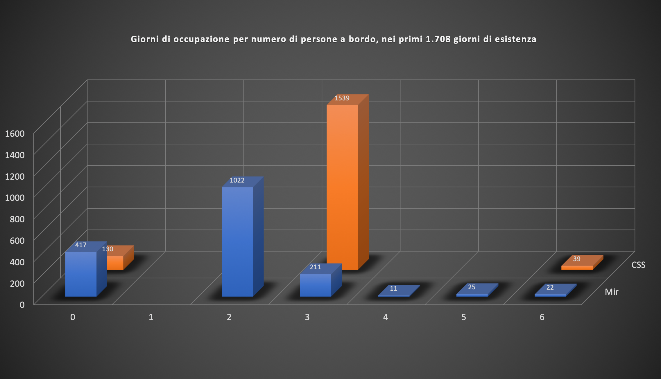 Grazie al grafico sottostante si vede ancora meglio come la CSS abbia avuto un grado di occupazione nettamene maggiore rispetto alla Mir, con 1.539 giorni a 3 persone contro i 1.022 giorni a sole due persone.