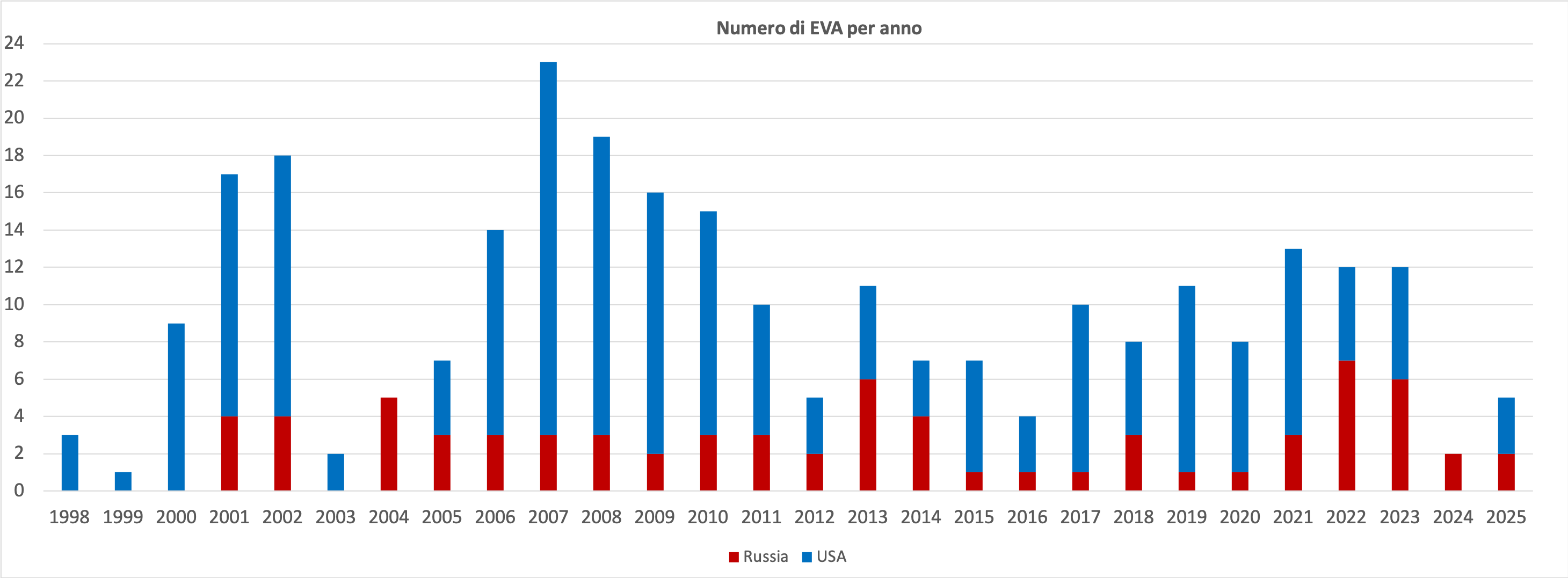 Resta invece basso il numero delle EVA, con sole 5 uscite nel 2025. Nel biennio 2024-2025 siamo quindi a quota 7 EVA, e per trovare un biennio altrettanto magro bisogna tornare al 2003-2004 quando anche allora ne vennero effettuate 7 (e curiosamente anche allora 2 nel 2003 e 5 nel 2004).
