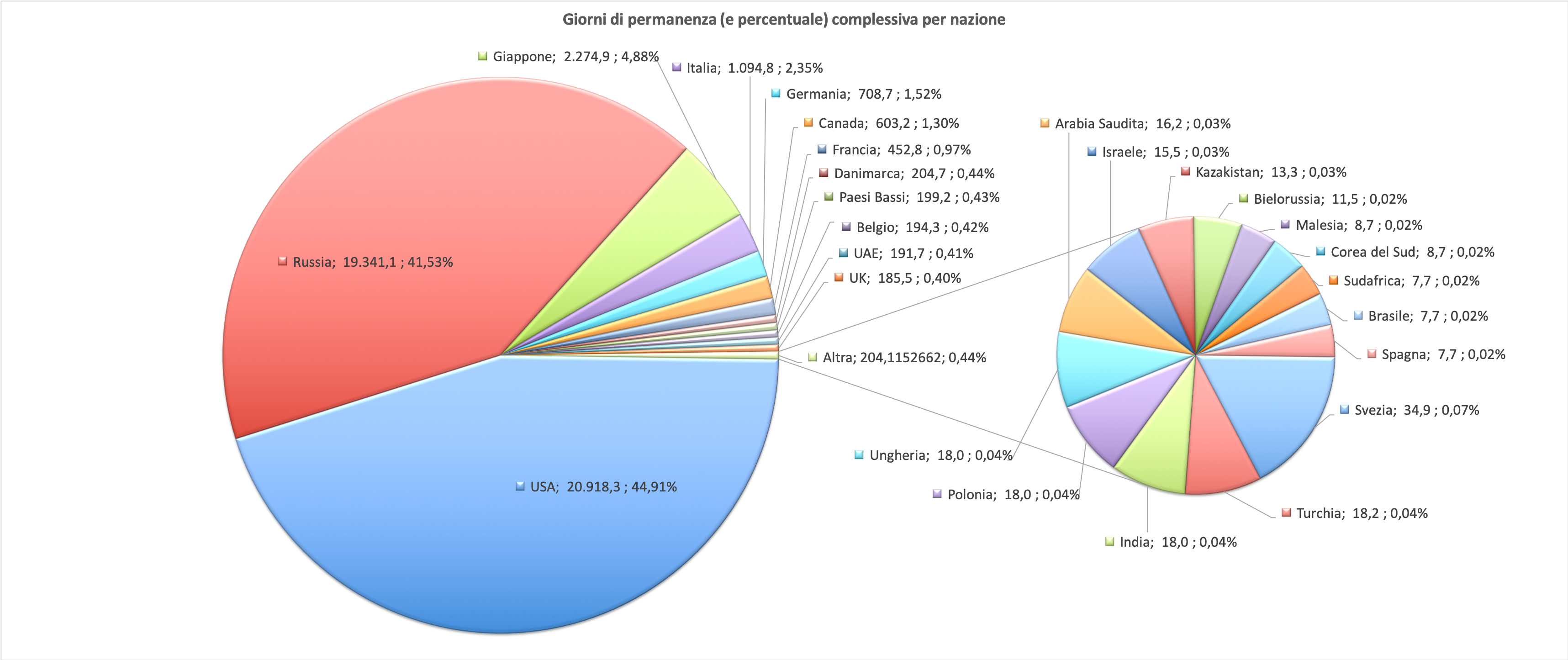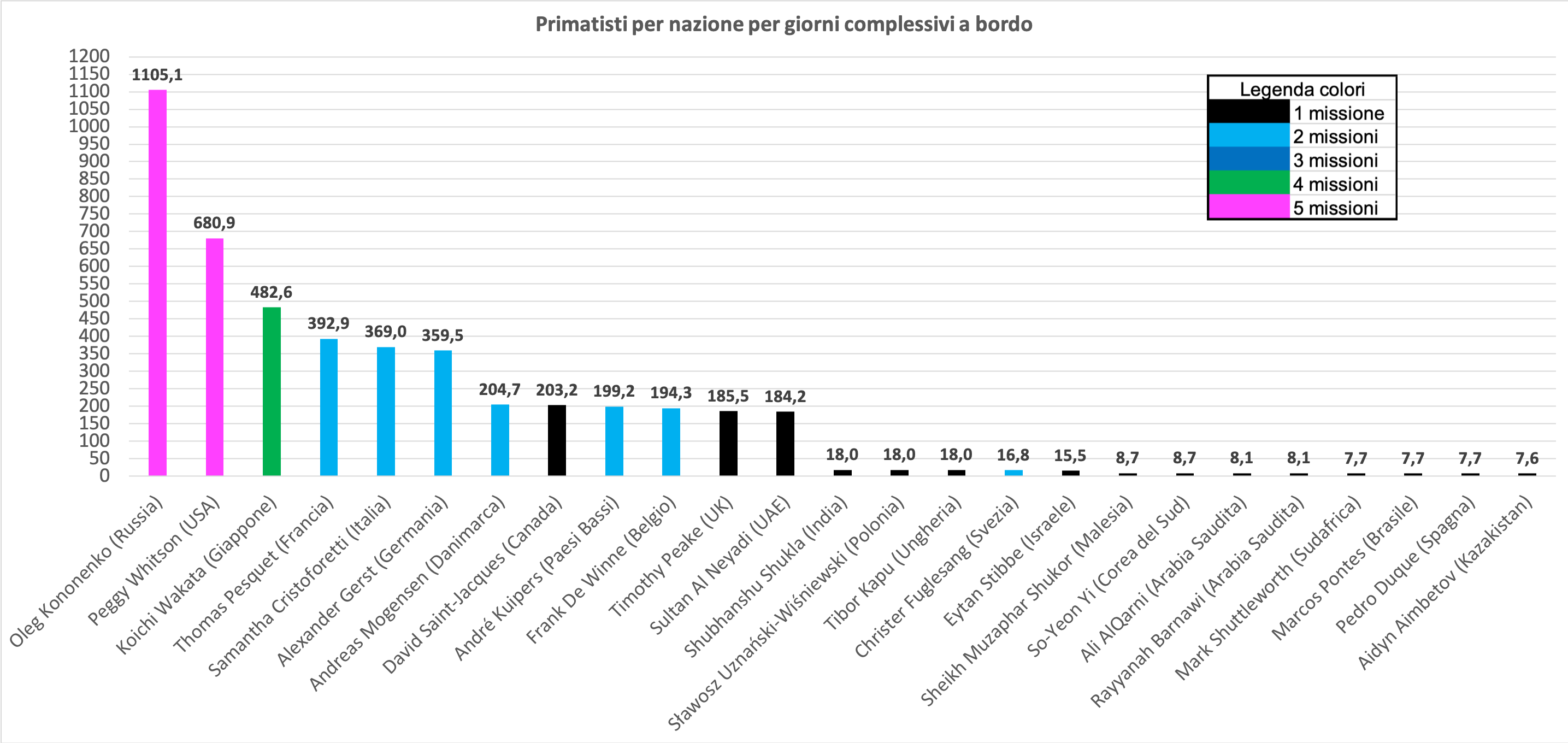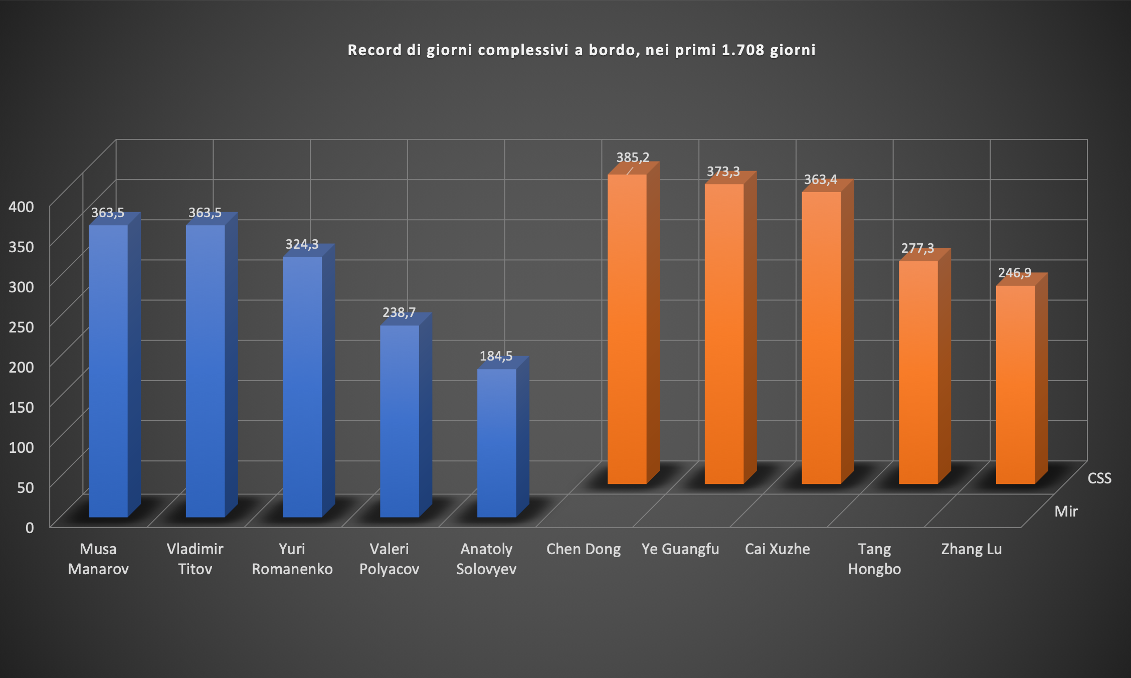 Terminiamo questo confronto dando un’occhiata a chi ha passato più tempo sulle rispettive Stazioni orbitanti. Come si vede, la Cina si è decisamente lanciata nelle permanenze prolungate dei suoi astronauti, che hanno superato quanto fatto sulla Mir nei primi 1.708 giorni.