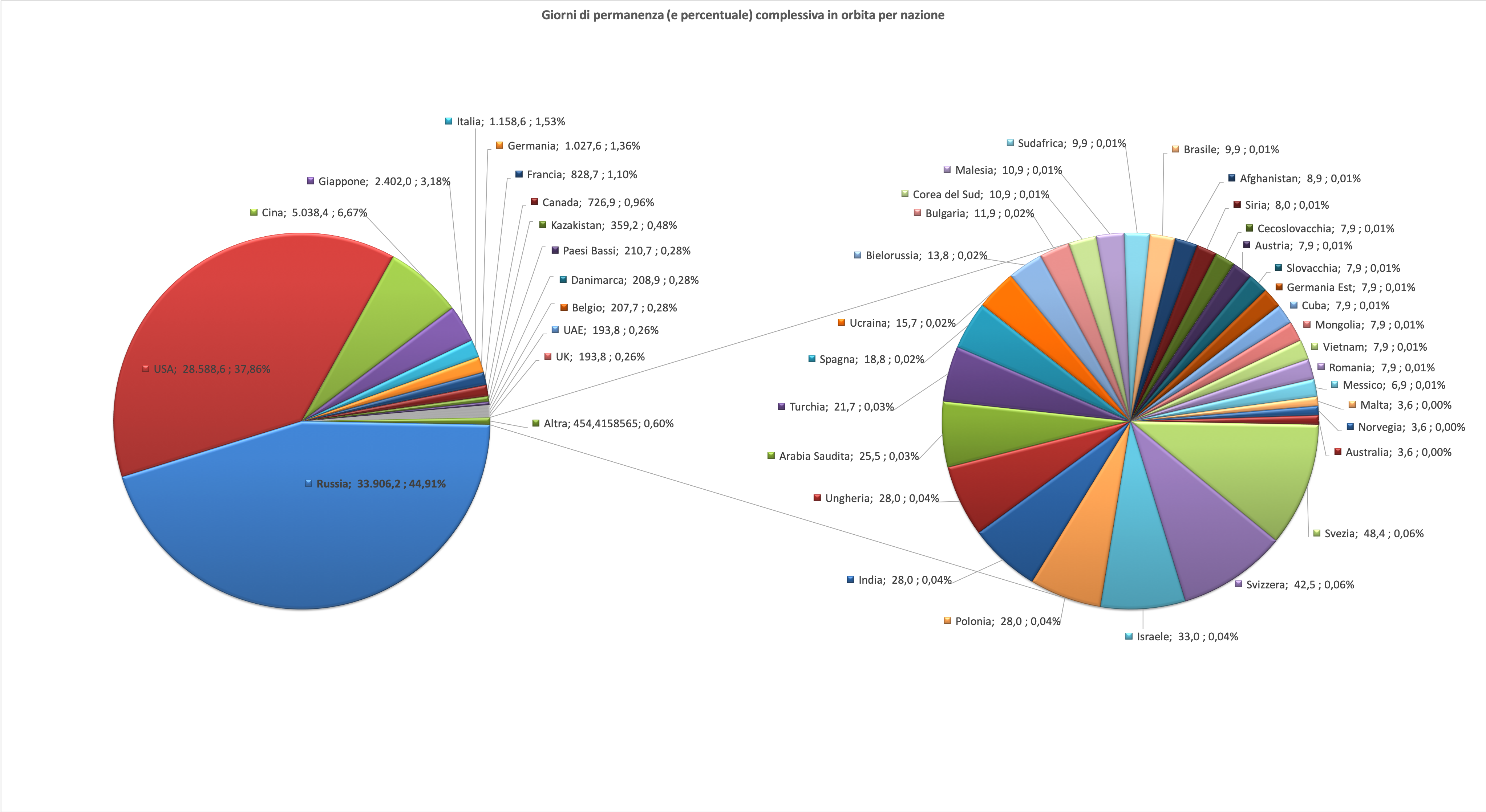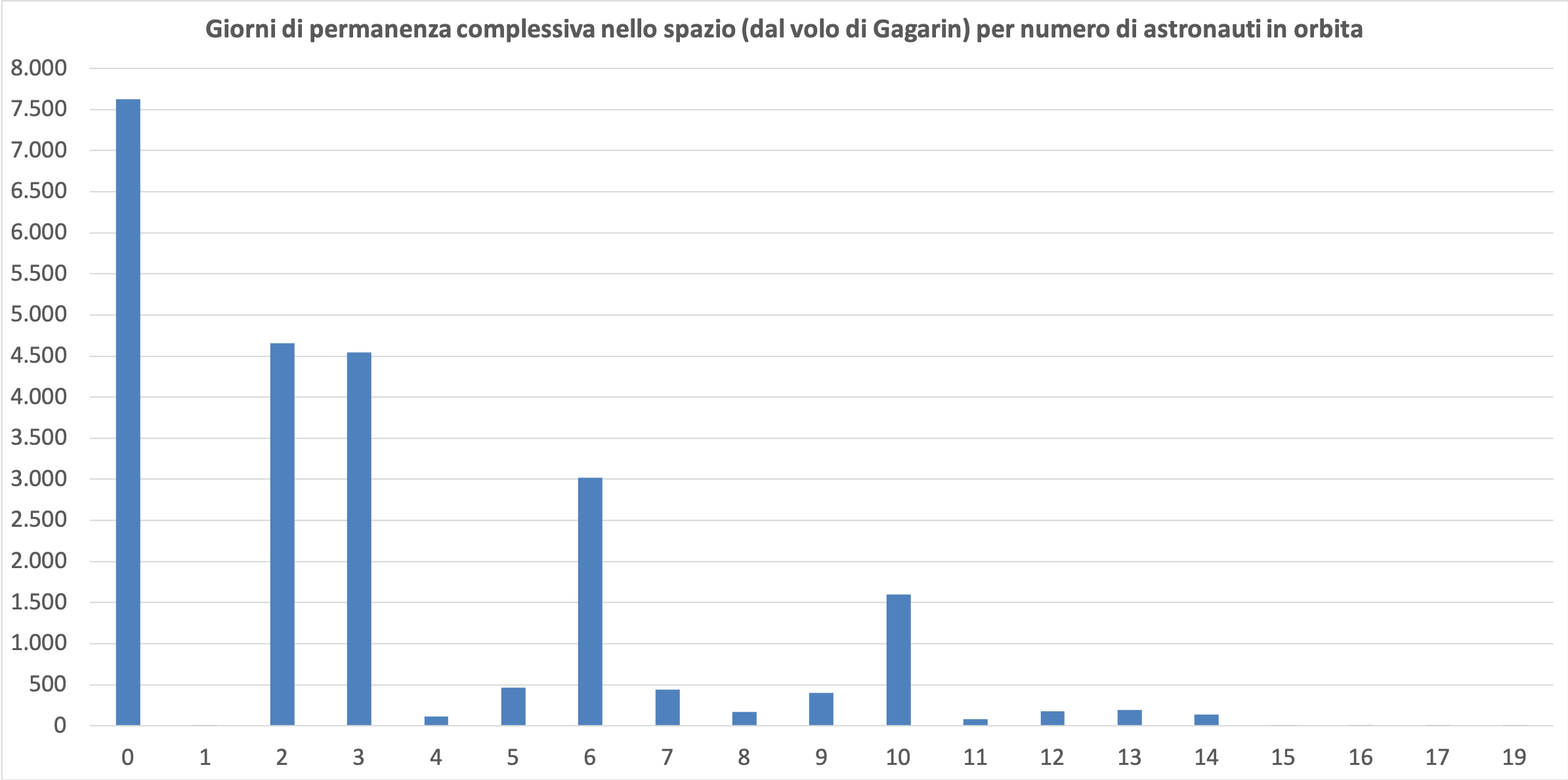 La colonizzazione dello spazio procede inesorabile ma con differenze comprensibilmente poco rilevabili da un anno all’altro. Da notare che la barra delle 10 persone contemporaneamente in orbita ha sfondato quota 1.500 giorni.