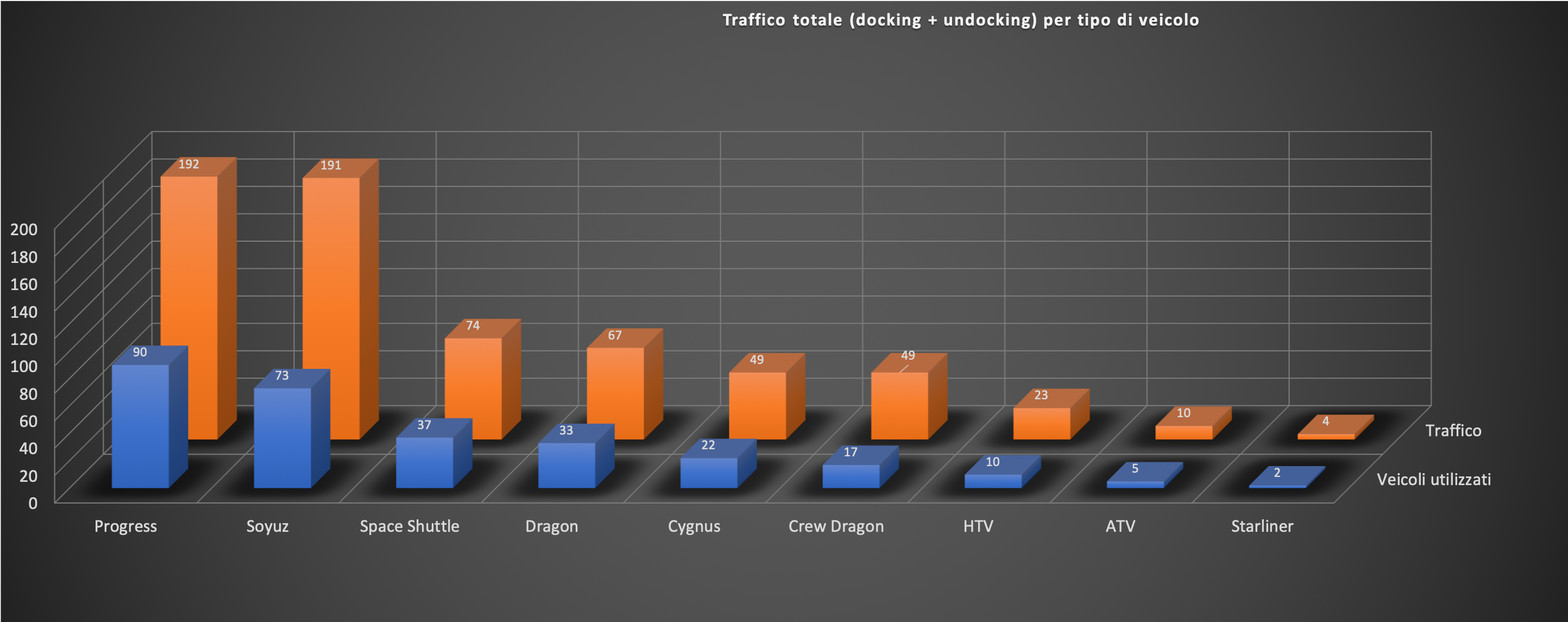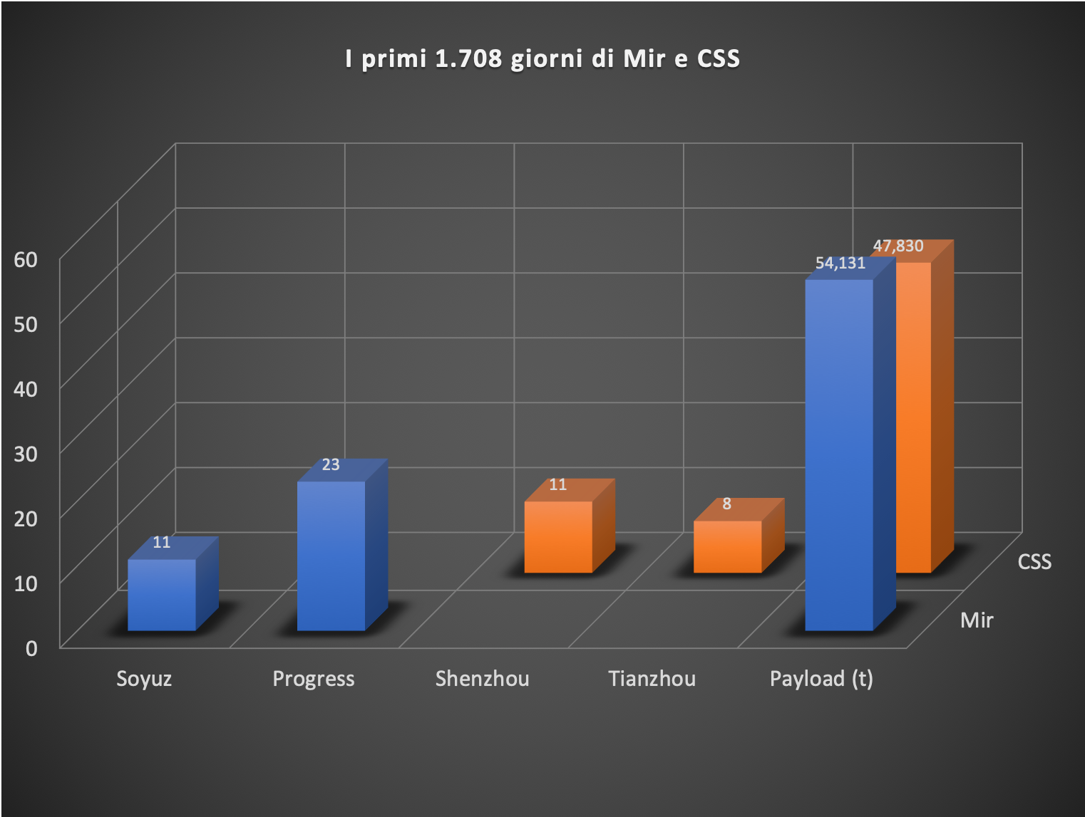 Entrando più in dettaglio sui singoli veicoli, vediamo che entrambe hanno (come si sa) utilizzato un veicolo per equipaggi (Shenzhou e Soyuz) e uno per i rifornimenti (Tianzhou e Progress). Se per i primi siamo assolutamente alla pari, per i secondi la Mir ne ha visti praticamente il triplo. Anche la quantità totale di payload portato a bordo vede una prevalenza della Mir, con 54 tonnellate contro meno di 48. Questo dato è particolarmente interessante se pensiamo che la Mir in quel lasso di tempo ha dovuto sostenere solo 16 membri di Expedition contro i 30 della CSS. Lascio ai più tecnici e insider del forum cercare di spiegare questa apparente incongruenza.
