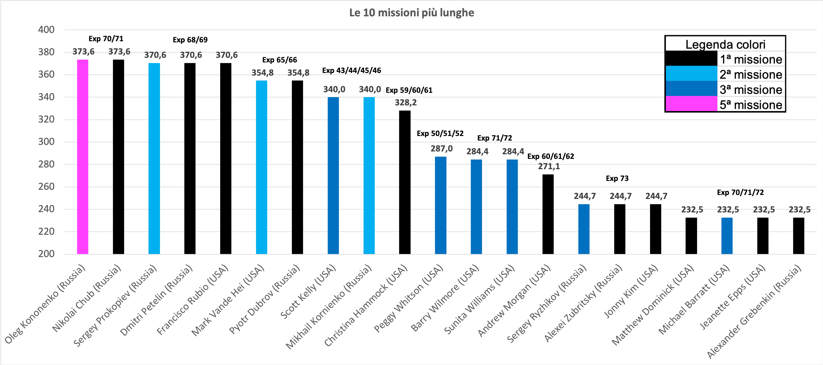 Nel 2025 abbiamo avuto tre nuovi “giovanotti” a bordo, che purtroppo fanno uscire dai primi 10 il nostro Luca Parmitano. Si tratta del russo Kirill Peskov, dell’ungherese Tibor Kapu e di un altro russo, Alexei Zubritsky che con i suoi 32,6 anni diventa il più giovane russo ad essere salito a bordo, nonché del più giovane membro di Expedition.