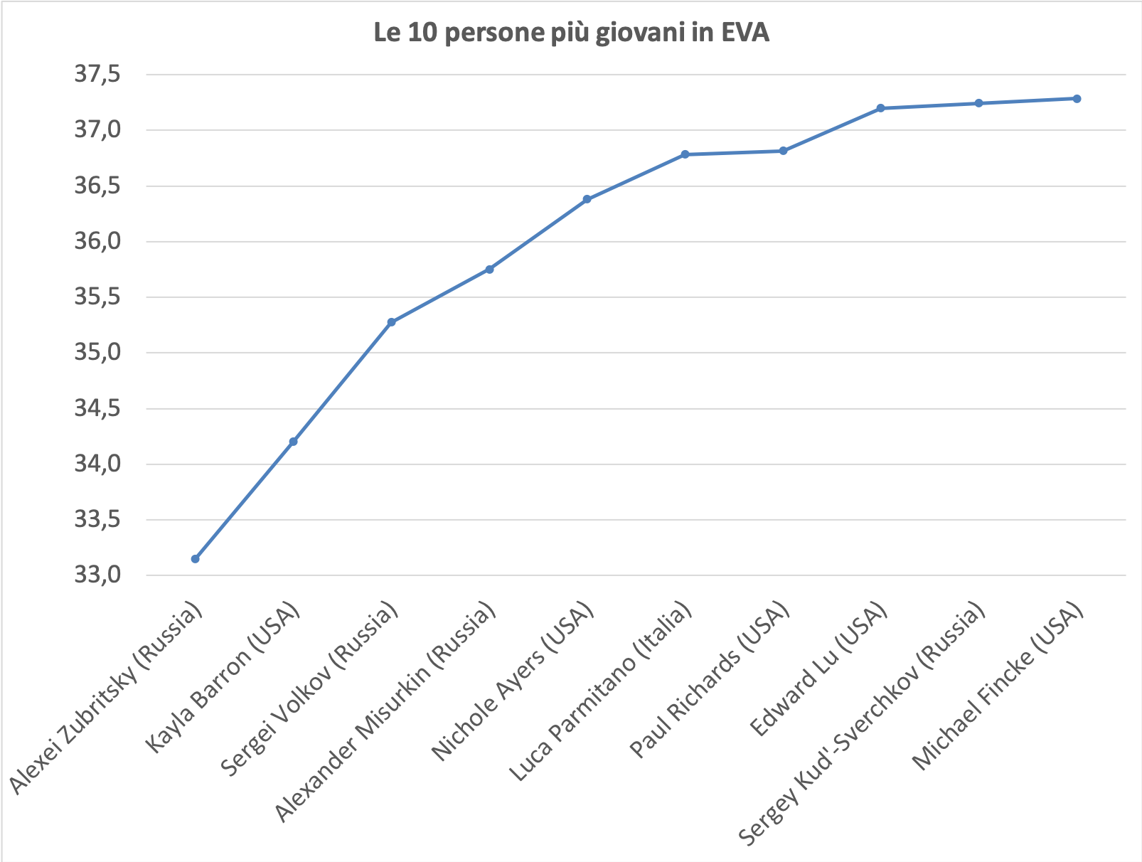 Zubritsky comanda anche la classifica delle 10 persone più giovani ad avere effettuato EVA sulla ISS, con 33,2 anni. Classifica dove il nostro Parmitano è quinto assoluto e primo fra i non russi o statunitensi!