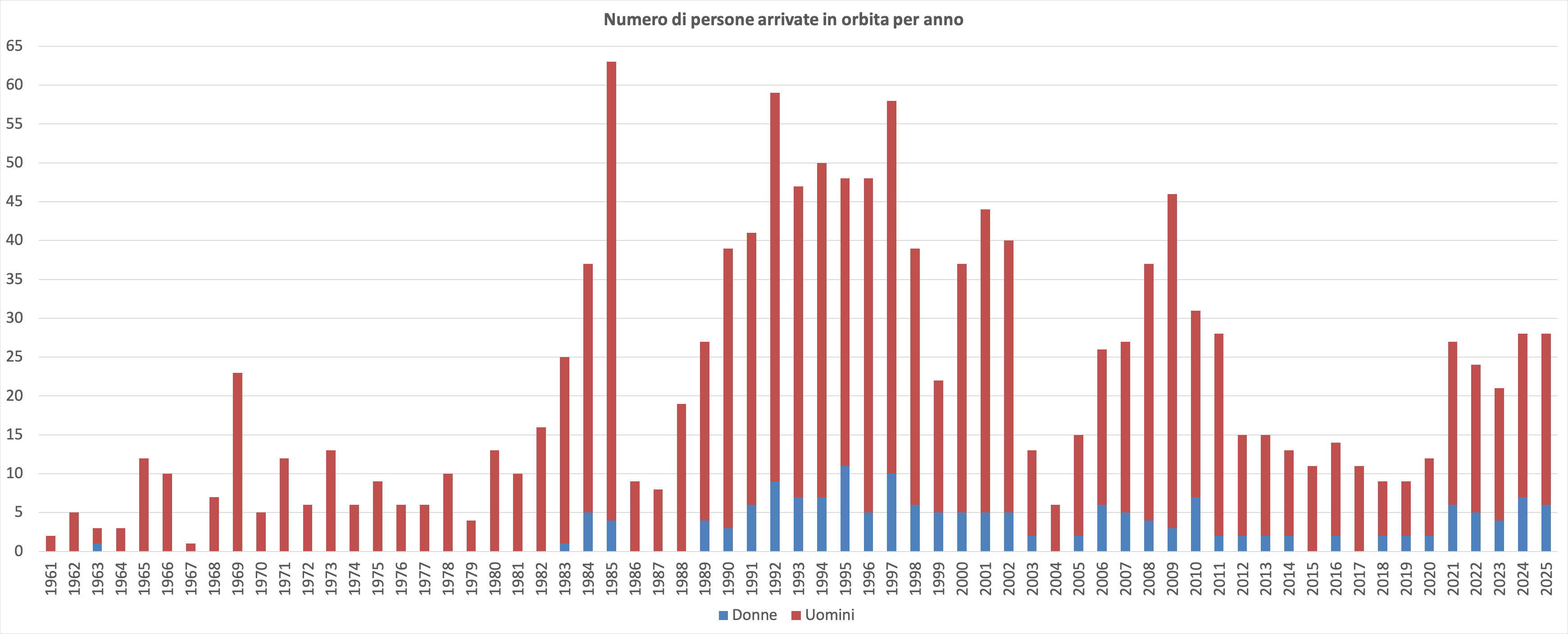 Il 2025 orbitale è stato quasi una fotocopia del 2024, con lo stesso numero di persone arrivate in orbita (28) con l’unica differenza che c’è stata una donna in meno (6 contro le 7 del 2024). Questo fa sì che gli uomini siano stati 22, con di conseguenza un numero così alto che non si verificava dal 2011 quando furono 26.