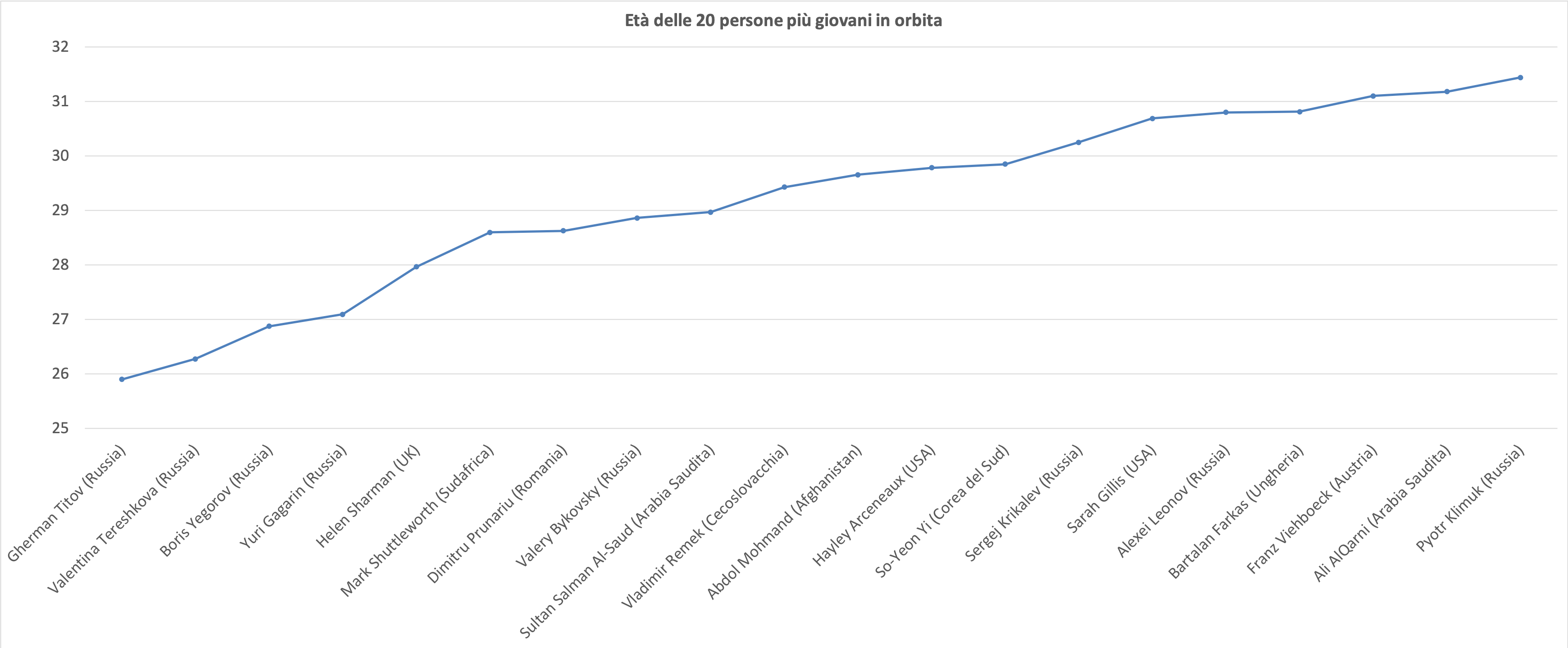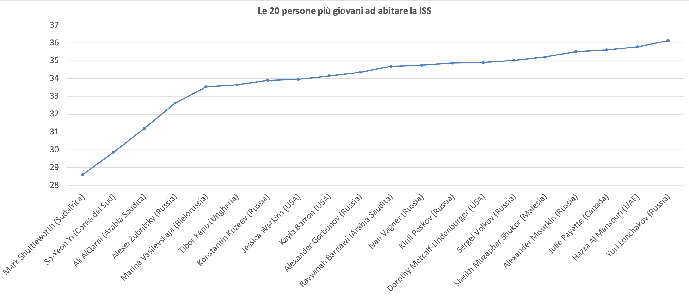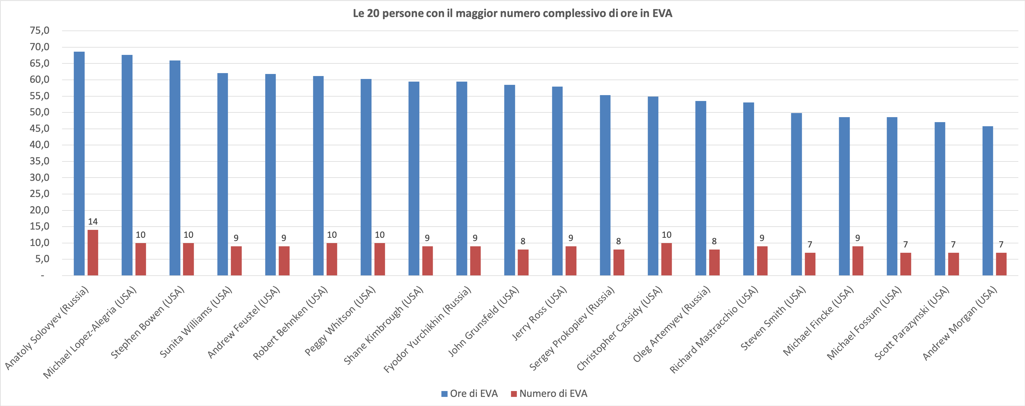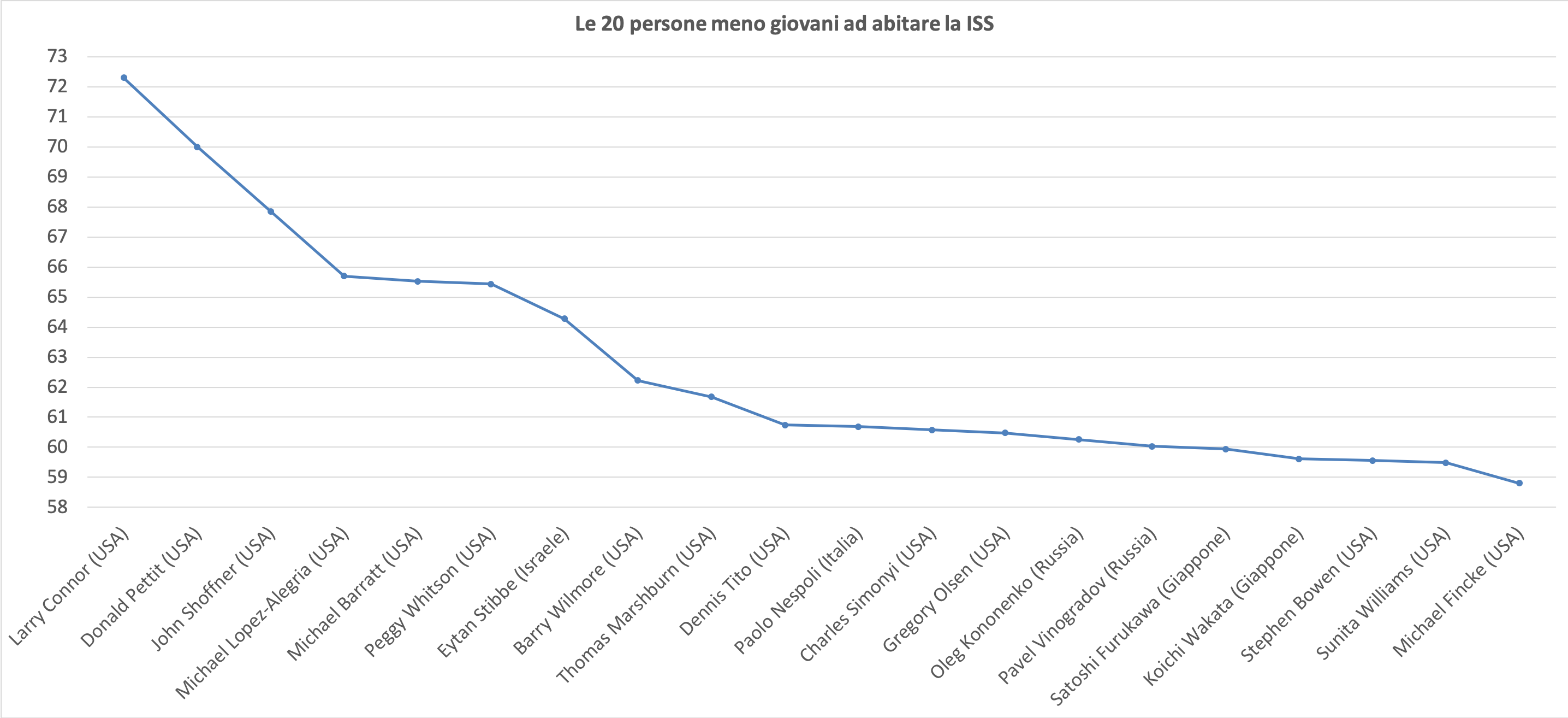 Chiudiamo l’excursus riguardante il programma ISS con i più esperti (alias meno giovani) ad aver abitato la Stazione Spaziale, dove 14 dei primi 20 sono statunitensi, ed anche qui il primo europeo è italiano (il nostro Paolo Nespoli).