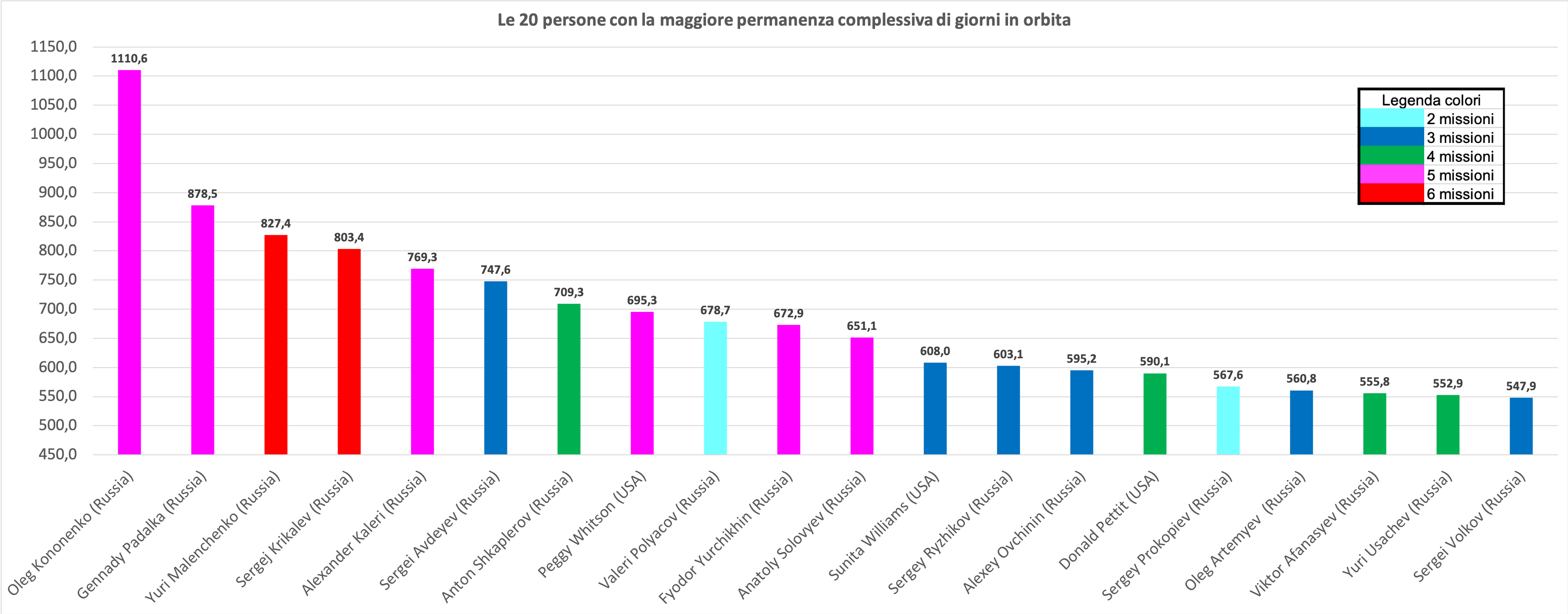 Variazioni che invece ci sono, e non poche, fra quelle che sono ora le 20 persone che hanno passato più tempo a bordo della ISS. Innanzitutto Peggy Whitson sale a quarto posto, lasciando così alla Russia “solamente” il podio. Russia che ora vede sette astronauti nei primi dieci, quando fino al 2024 ne aveva nove su dieci! Gli USA ora ne hanno sei nei primi 20, contro i cinque del 2024.