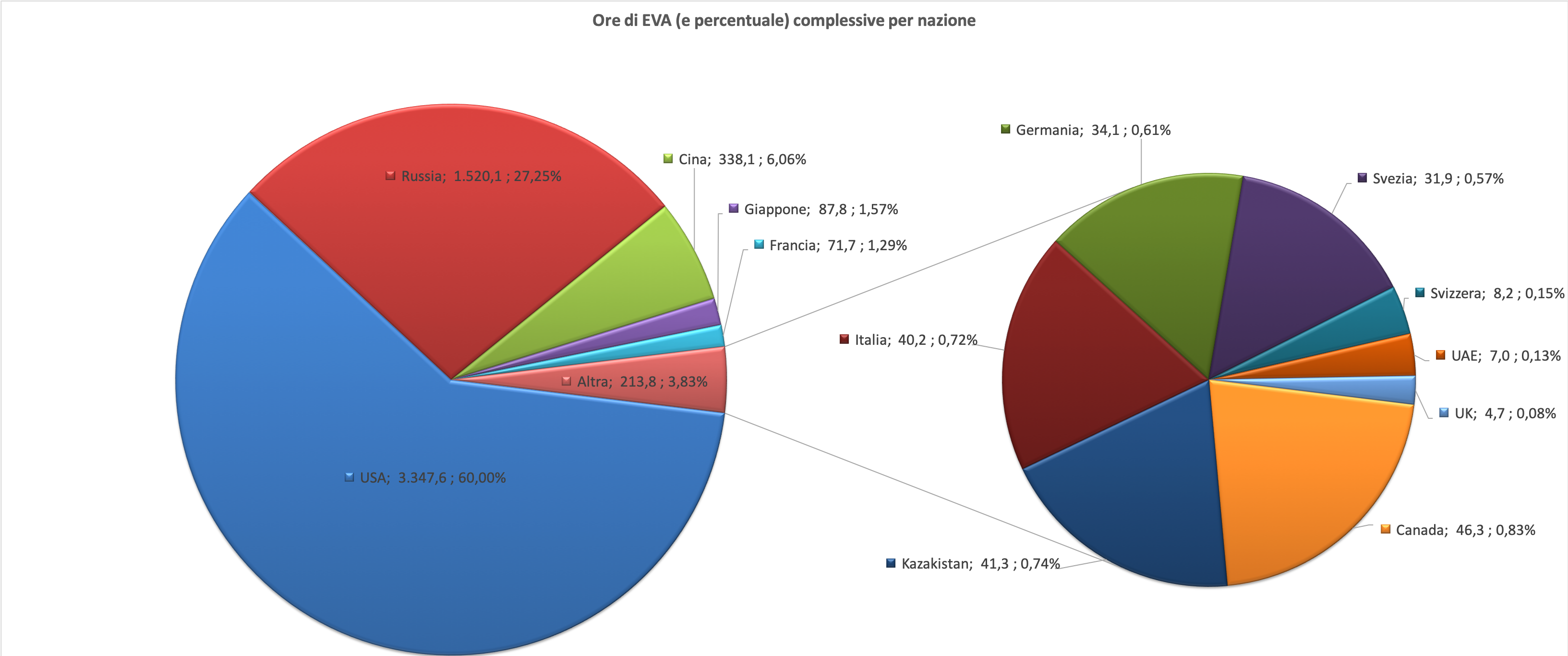 Nulla invece è cambiato nella ripartizione delle EVA per nazione, con i primi tre posti irraggiungibili per qualsiasi altra nazione e ben separati fra loro stessi.