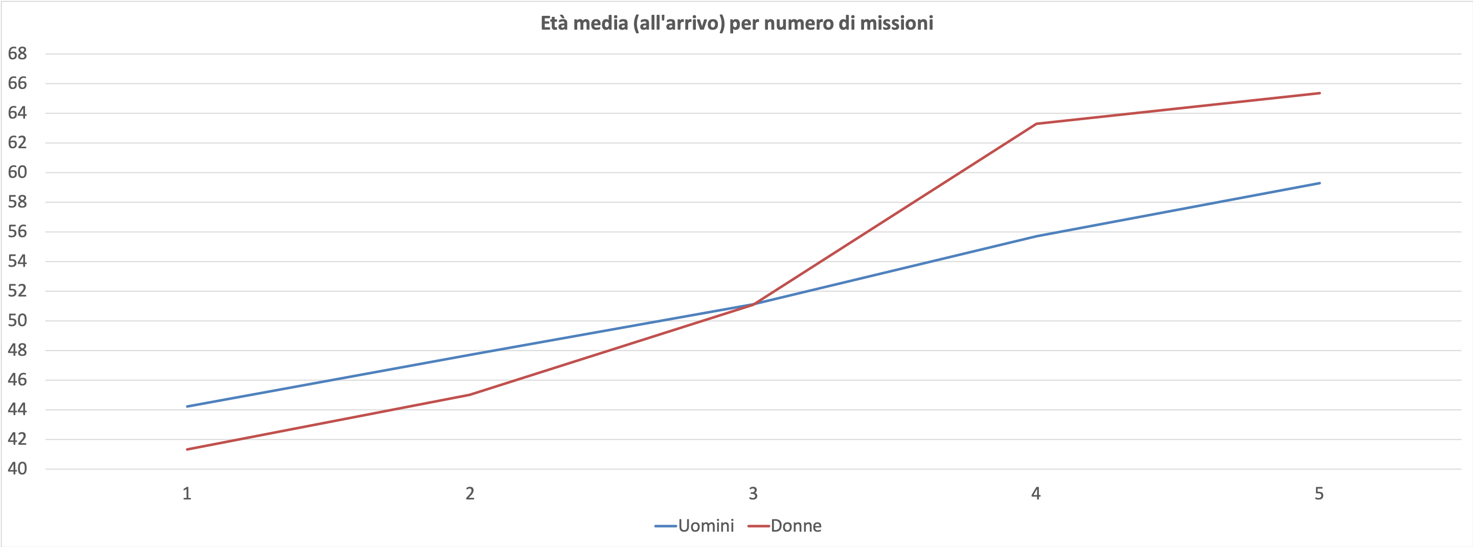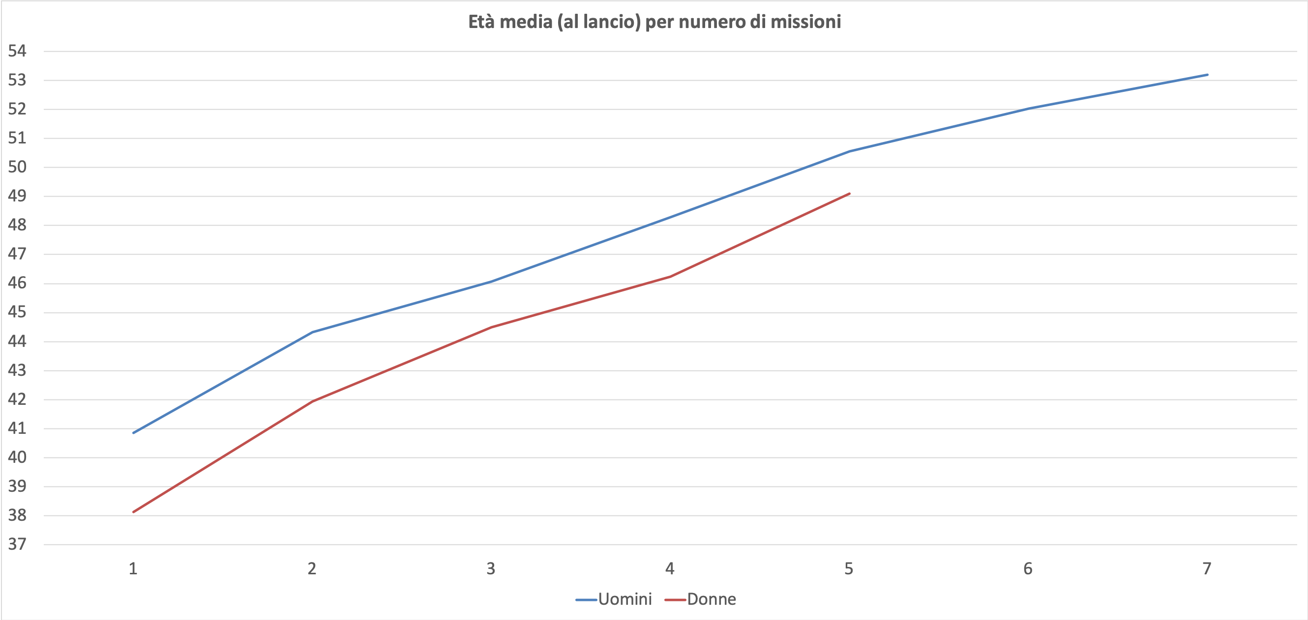 Ormai appare consolidato il fatto che a parità di numero di missioni effettuate, le donne godono di un vantaggio anagrafico, con le due linee che corrono sostanzialmente parallele per tutti i numeri di missione esaminati. Continuano invece a non esserci donne che hanno effettuato più di 5 missioni spaziali.