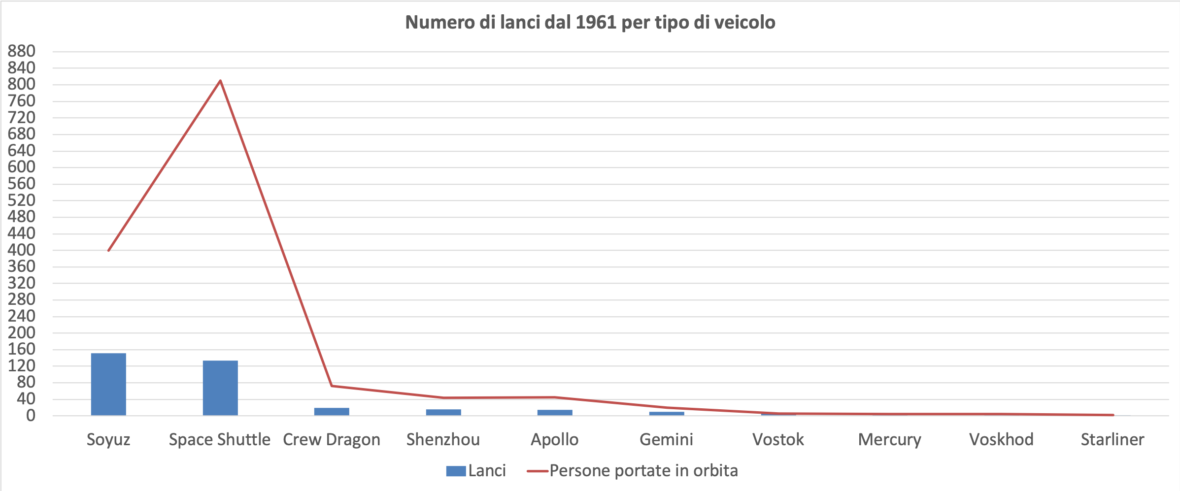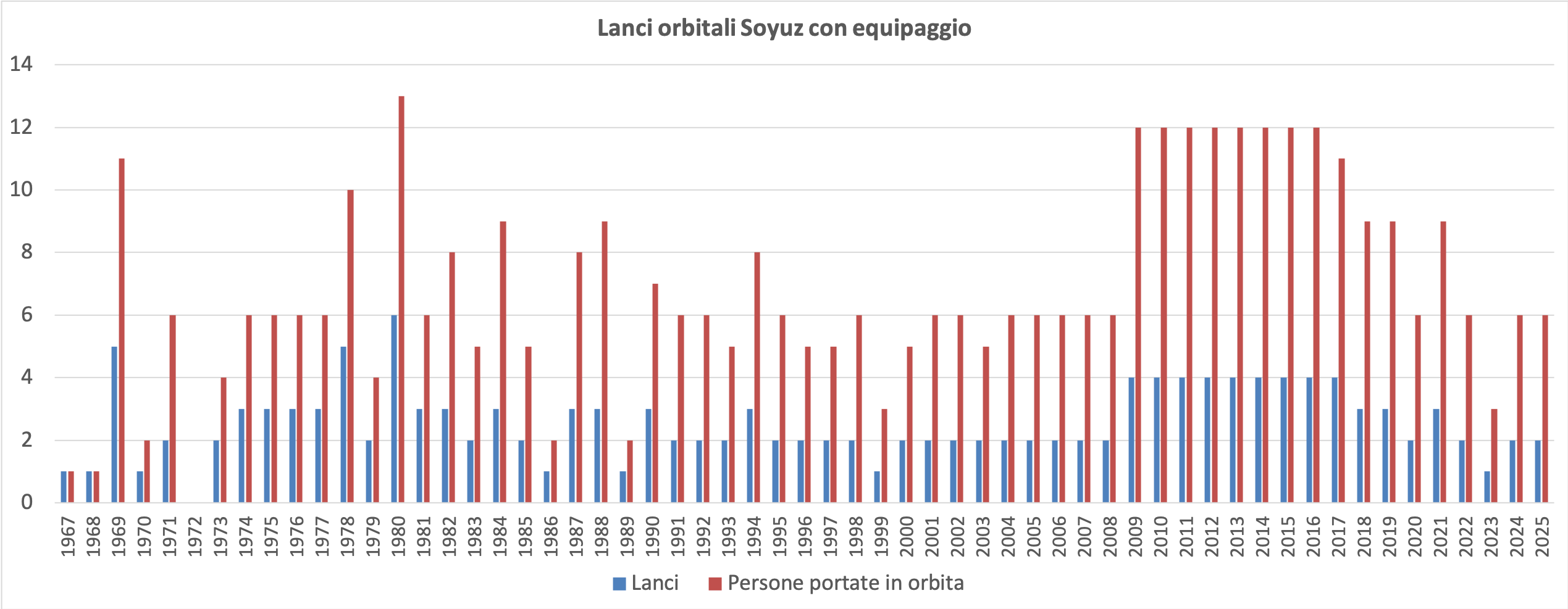 E allora festeggiamo con questo ulteriore grafico che rappresenta tutti i lanci Soyuz con equipaggio dal 1967 (anno del debutto di questo veicolo) ad oggi.
