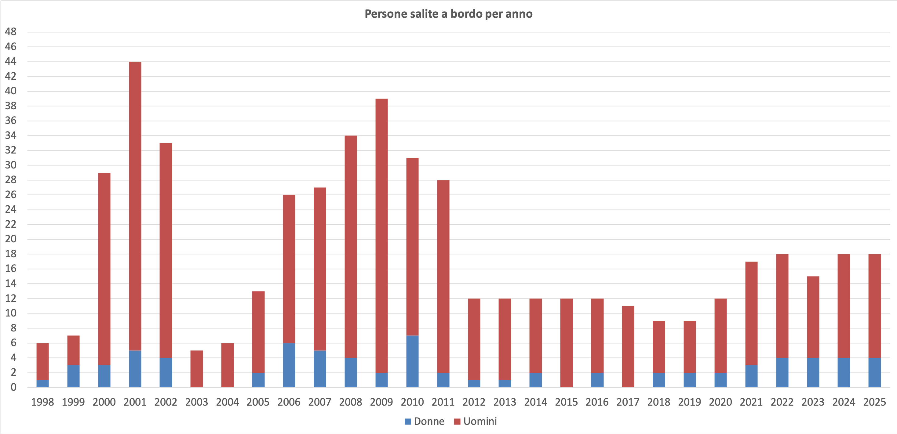 Restringendo il campo alle sole attività riguardanti la ISS, per numero e ripartizione fra i sessi delle persone salite a bordo il 2025 è stato la fotocopia assoluta del 2024 e del 2022.