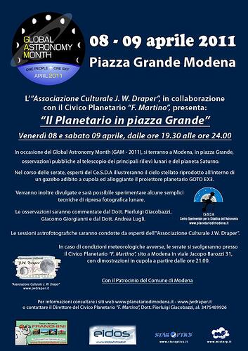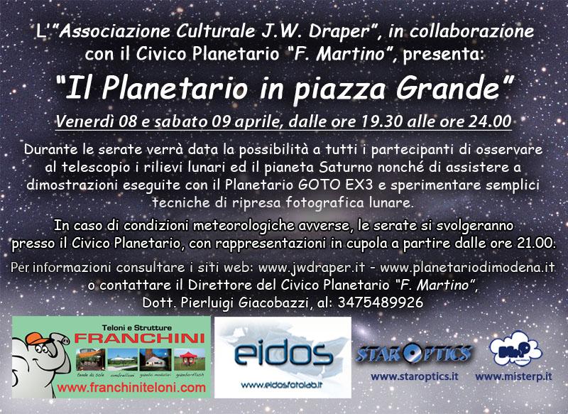 desideravo segnalarvi amici questo evento astronomico che si terrà alla fine della prossima settimana a modena e precisamente in piazza grande, cioè in pieno centro storico. facendomi portavoce dei responsabili del nostro planetario cittadino: appassionati astrofili modenesi e non accorrete numerosi voi e le vostre famiglie, bimbi compresi! riporto qui sotto le locandine.