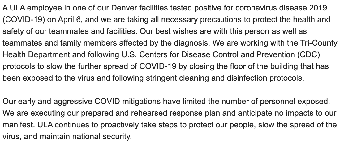 La situazione sta sfuggendo di mano… e potrà solo peggiorare… assurdo per davvero. Le uniche cose che dovrebbero andare avanti dovrebbero essere l’Atlas 541 per Perseverance e il lavoro sulle Dragon/Cygnus di rifornimento. Personale minimo necessario. Il resto tutti a casa. Invece si continua con questa follia…