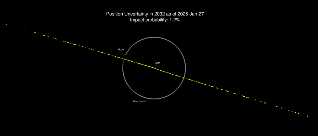 NASA scrive: “With this new data, the chance of an impact with the Moon increased slightly to 1%.” Sarebbe veramente uno spettacolo vederlo impattare la Luna, magari dopo averci piazzato un sismografo.
