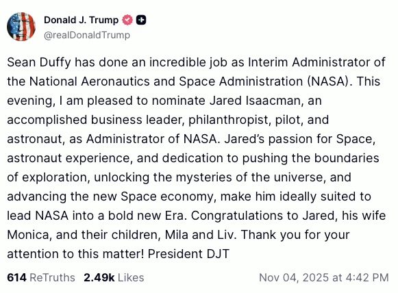 Politico ha pubblicato un riassunto del “manifesto” elaborato da Isaacman in cui viene proposta una riorganizzazione radicale della NASA. Secondo l’articolo il documento sarebbe dovuto restare confidenziale. (tra le righe mi pare venga suggerito che sia stato fatto uscire da Duffy per mettere in difficoltà il suo “rivale”)