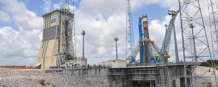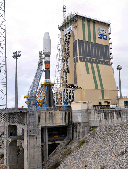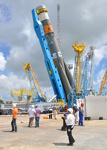 A Kourou, nella Guiana Francese, per la prima volta un razzo della serie Soyuz è stato eretto sul Pad di lancio.