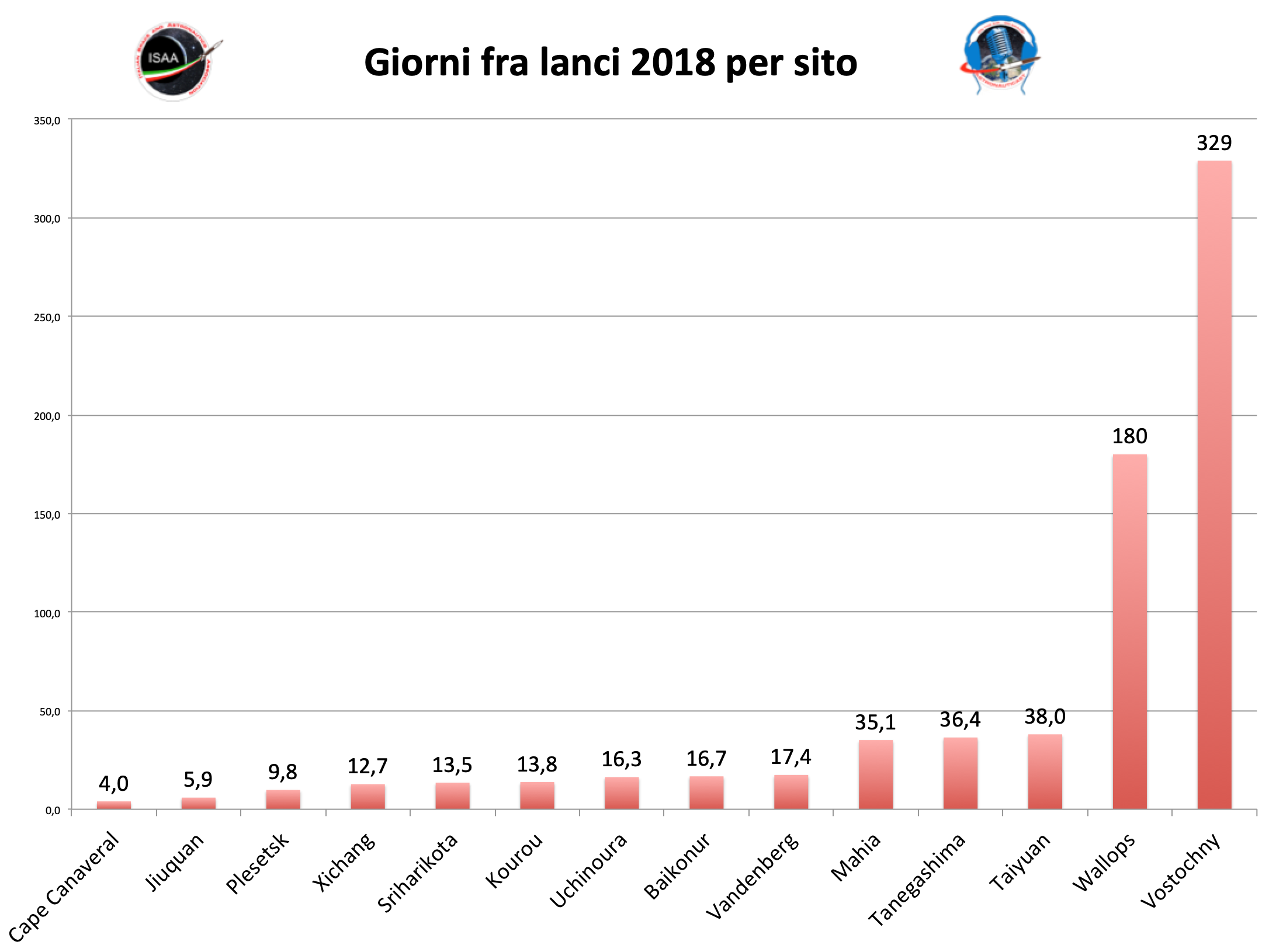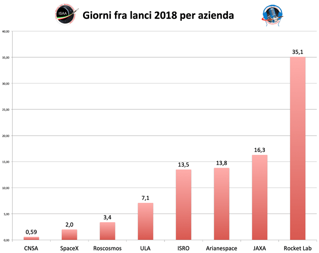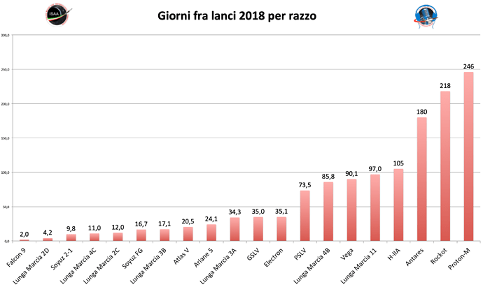 Il primato per i lanci più ravvicinati è sempre di Cape Canaveral con 4 giorni seguita dai 6 giorni di Jiuquan e i 10 di Plesetsk. Curioso il caso di Vostochny i cui due lanci sono avvenuti a ben 329 giorni di distanza (il 1 febbraio ed il 27 dicembre) ma alla stessa identica ora, le 2:07 GMT. Ma non è da meno Uchinoura dove gli unici due lanci del 2018 sono avvenuti nel giro di 16 giorni uno dall’altro (il 17 gennaio ed il 3 febbraio). Da rilevare anche l’ottimo risultato dell’India che sebbene come abbiamo visto è rimasta 158 giorni senza effettuare lanci è stata in grado di effettuare due lanci da Sriharikota a distanza di 13,5 giorni facendo meglio anche di Kourou.