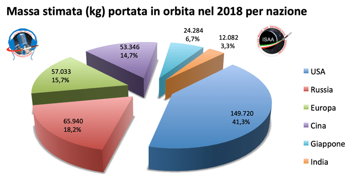 Se la Cina ha effettuato il maggior numero di lanci orbitali non risulta però la nazione ad aver portato la quantità maggiore di massa nello spazio. Purtroppo il dato sulla massa portata in orbita non sempre è disponibile a causa dei numerosi lanci coperti da segreto militare, e quando lo è spesso si tratta di un dato di massima oppure parziale, soprattutto nel caso siano presenti molti payload diversi sullo stesso volo. Molto raramente quindi è dato sapere con estrema esattezza l’ammontare della massa portata in orbita ad ogni lancio. Tuttavia con i dati a noi noti si possono comunque fare delle stime abbastanza precise e quindi non molto distanti dai valori reali, che tra l’altro mai nessuno saprà con certezza. Nei casi in cui non esiste alcun dato sulla massa portata in orbita ho calcolato per ogni versione dei vari razzi la media del carico portato in orbita quest’anno (o negli anni precedenti nei casi in cui manchino totalmente dati nel 2018) nei lanci in cui questo valore era noto e l’ho applicato ai lanci senza informazioni. Ben sapendo che i vari valori non possono affatto essere quelli reali si tratta comunque di stime ampiamente accettabili nel quadro generale e più che sufficienti per dare un’ordine di grandezza e mettere a confronto i vari razzi e le varie nazioni.